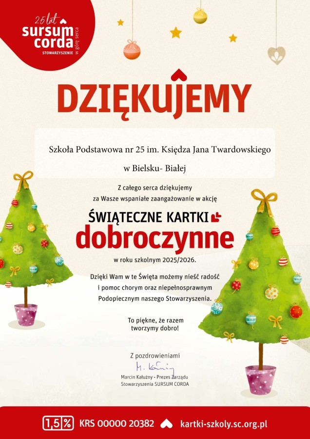 Cała społeczność naszej szkoły po raz kolejny udowodniła, jak wielką moc ma dobro. W ramach akcji „Świąteczne Kartki Dobroczynne” przeprowadzonej w naszej szkole, zebrano 130 zł, które zostały przekazane za pośrednictwem Stowarzyszenia Sursum Corda na leczenie i rehabilitację chorych dzieci – podopiecznych stowarzyszenia.