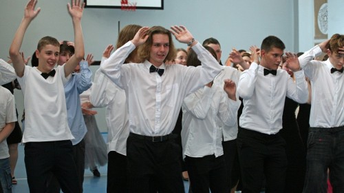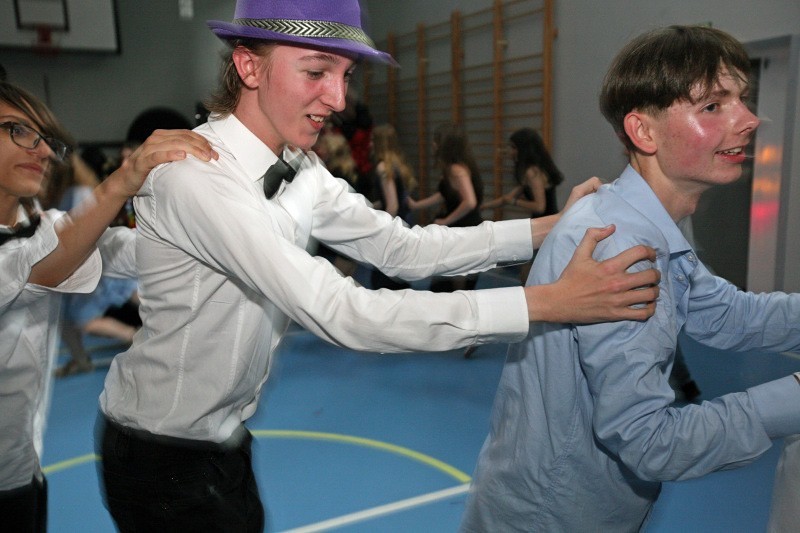 Sala gimnastyczna zapełniła się paniami w sukniach balowych i panami w muchach.