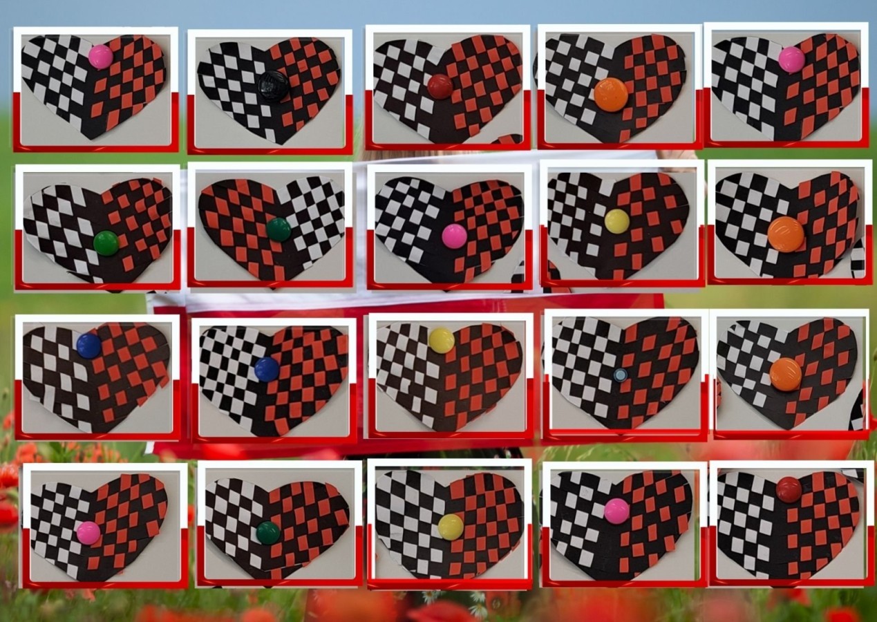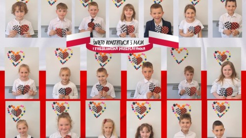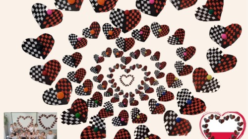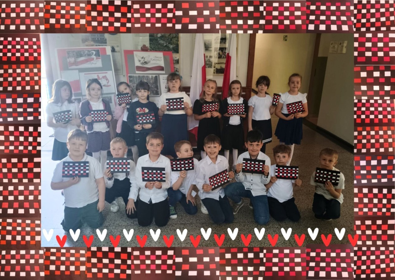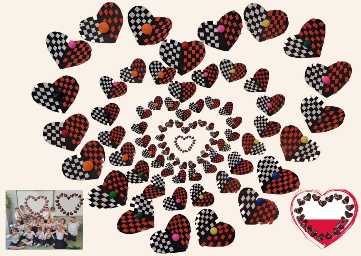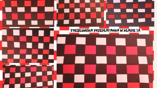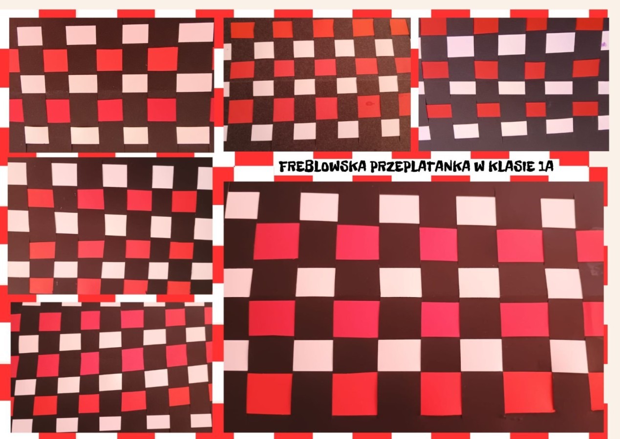 Na zakończenie tej wspaniałej „Przygody ze sztuką” z okazji Świąt Majowych pierwszaki wykonały freblowskie przeplatanki – biało – czerwone flagi oraz serduszka.