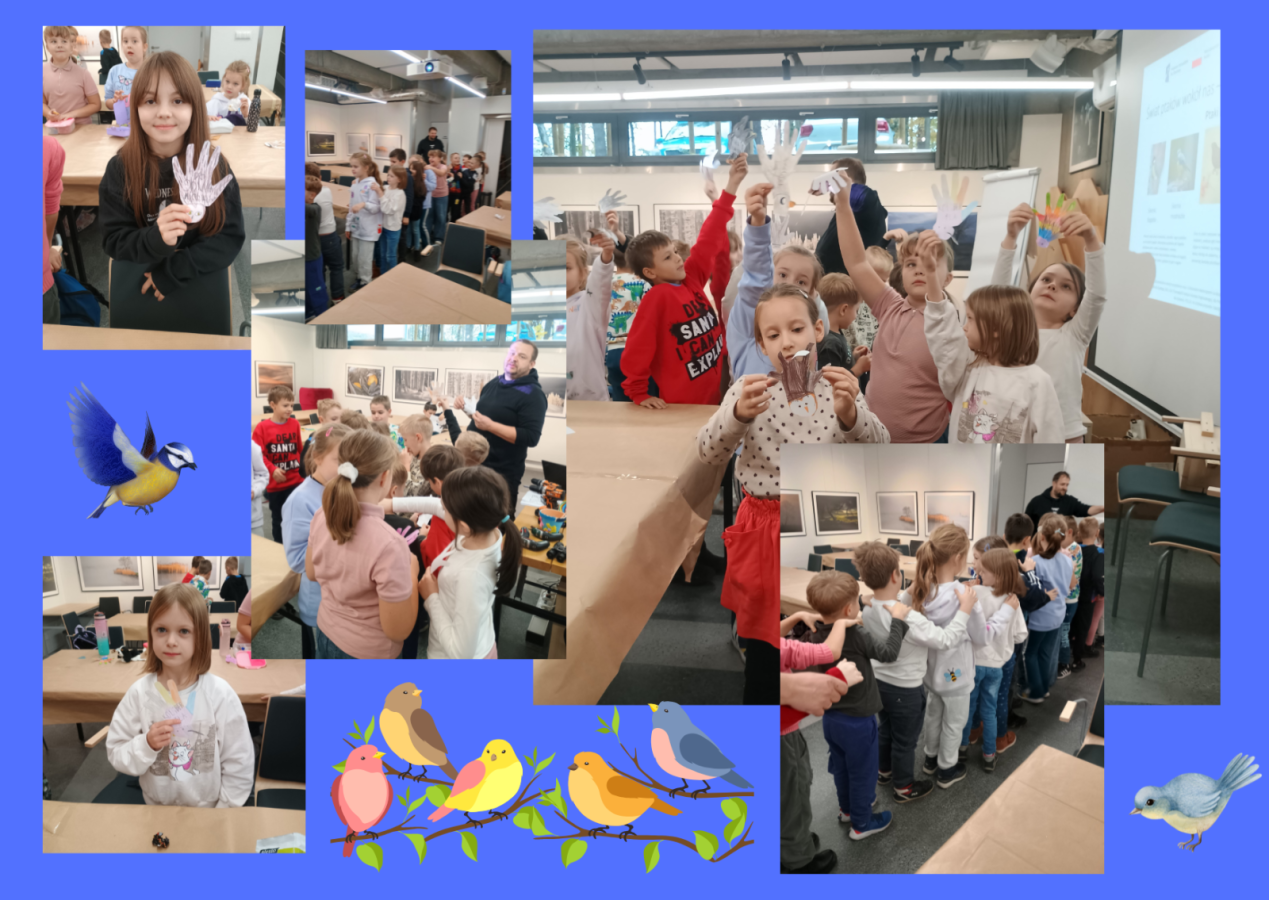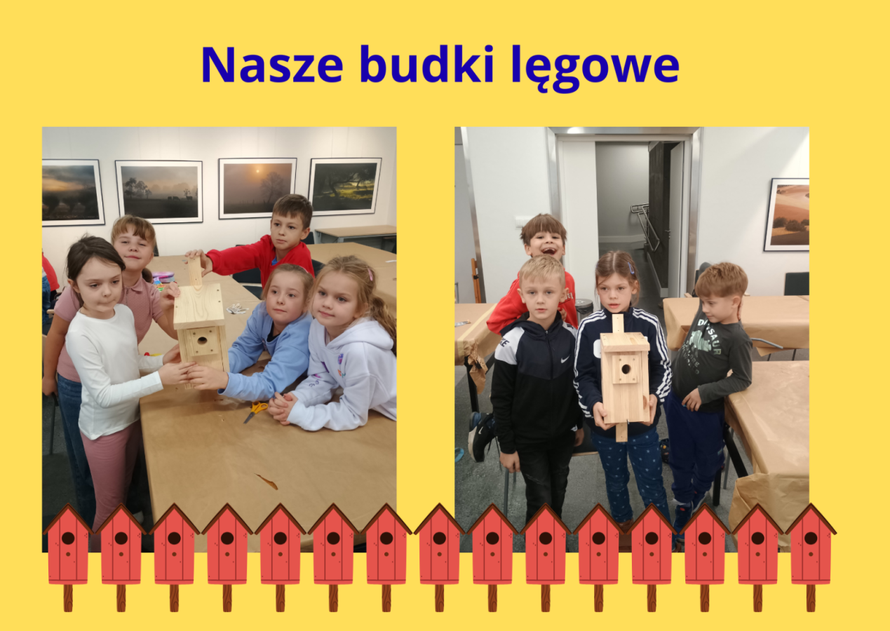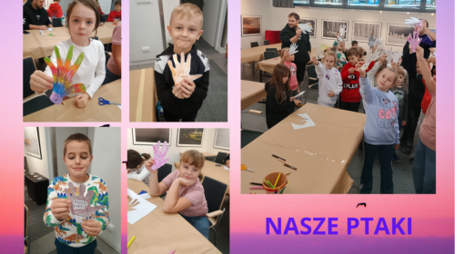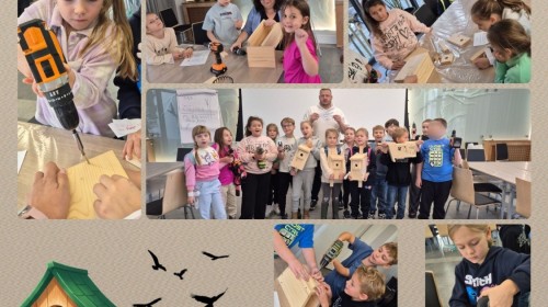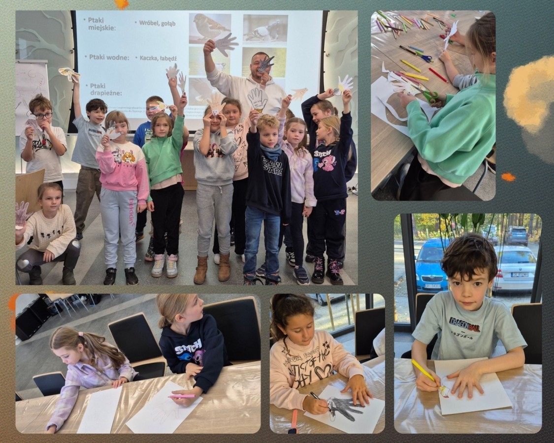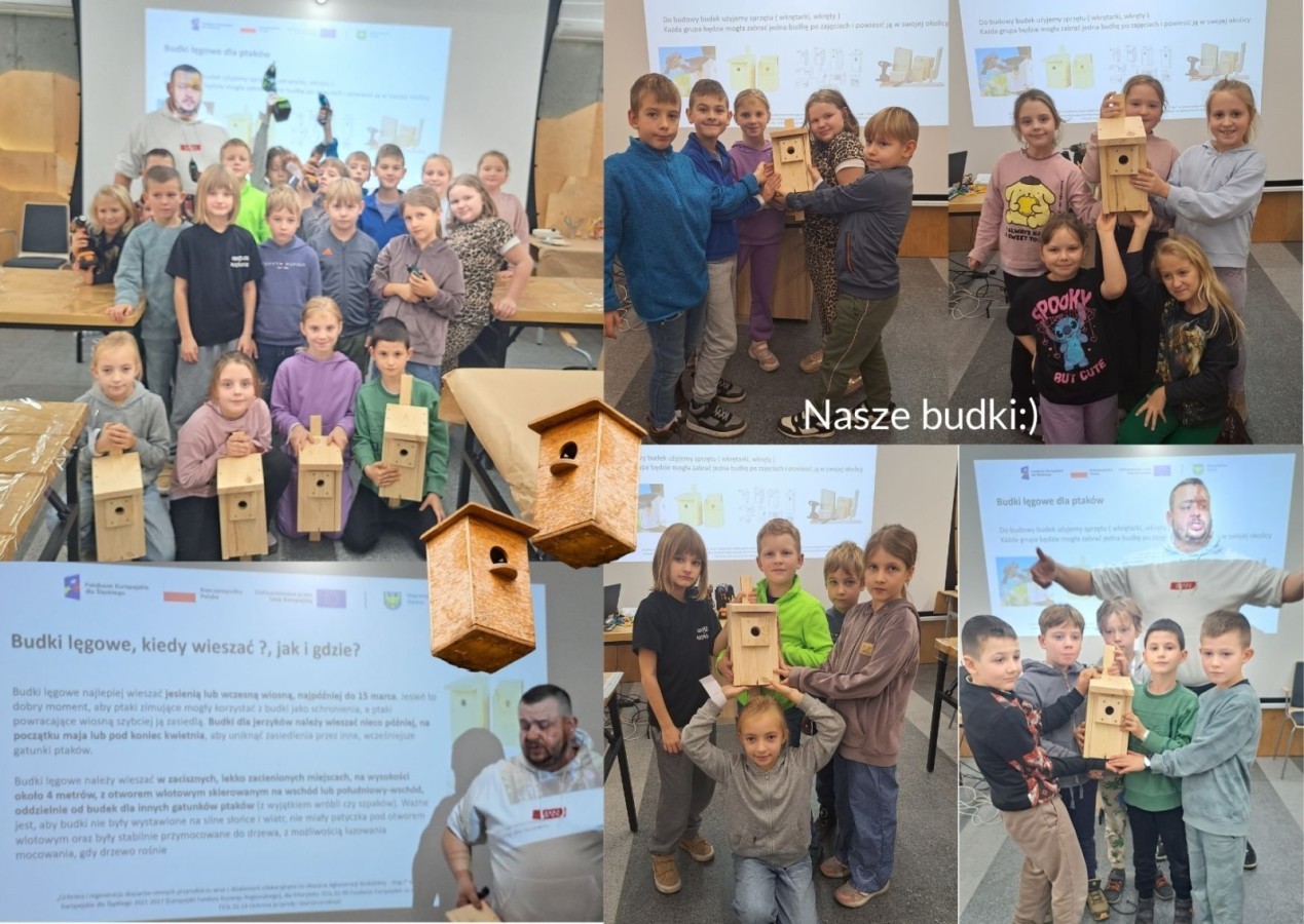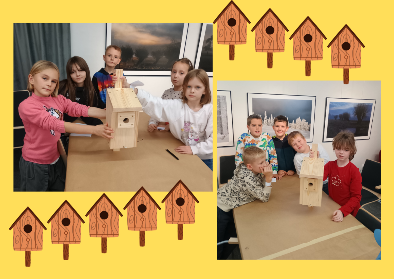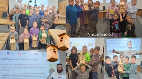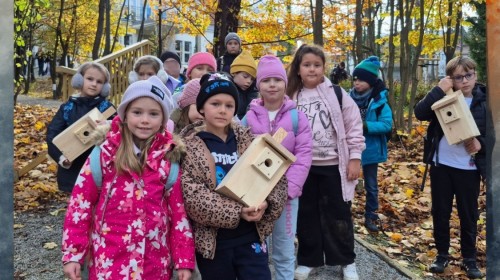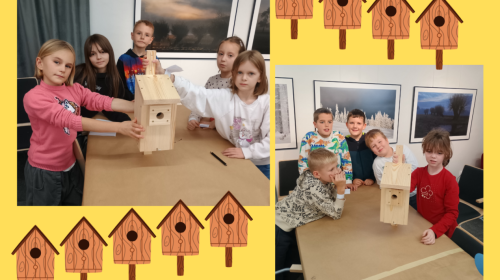 Kolejnym wykonanym zadaniem były zajęcia w Centrum Edukacji Ekologicznej „Ekosynteza” pt. „Poznajemy ptaki”. W czasie zajęć dzieci nie tylko nauczyły się rozpoznawać najbardziej popularne ptaki zamieszkujące nasz kraj ale również dowiedziały się po co się obrączkuje ptaki, jak je chronić. Samodzielnie wykonały z przygotowanych materiałów budki lęgowe dla ptaków, które zostaną przymocowane na drzewach w pobliskim lasku po ustaleniu tego z leśnikiem. Podsumowaniem zajęć było oglądnie ptaków w ich naturalnym środowisku przez lornetki