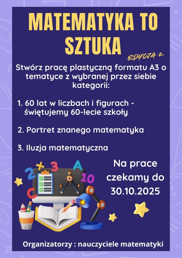 Serdecznie zapraszamy uczniów klas IV–VIII do udziału w kolejnej edycji szkolnego konkursu plastycznego „Matematyka to sztuka”. W tym roku konkurs jest wyjątkowy, ponieważ jedna z kategorii nawiązuje do jubileuszu 60-lecia naszej szkoły.