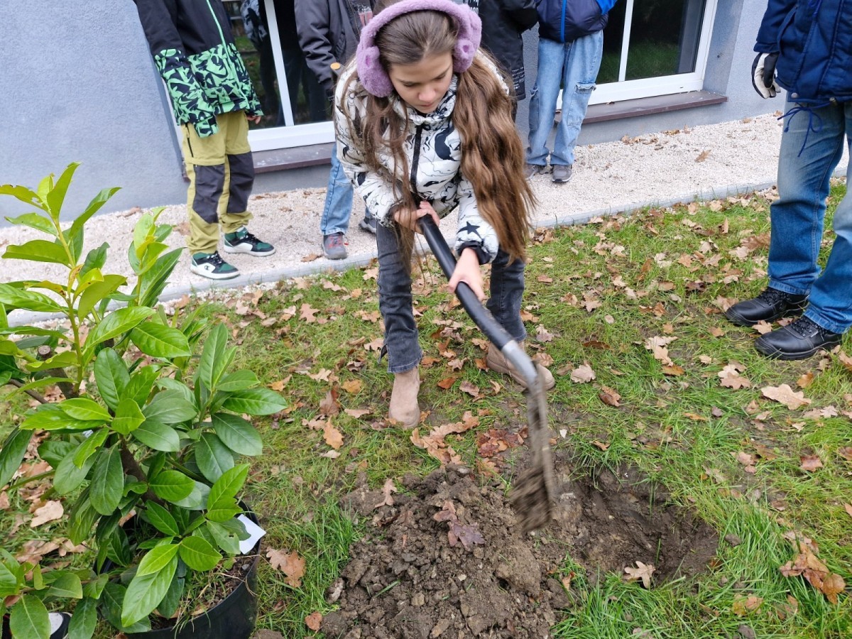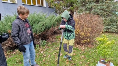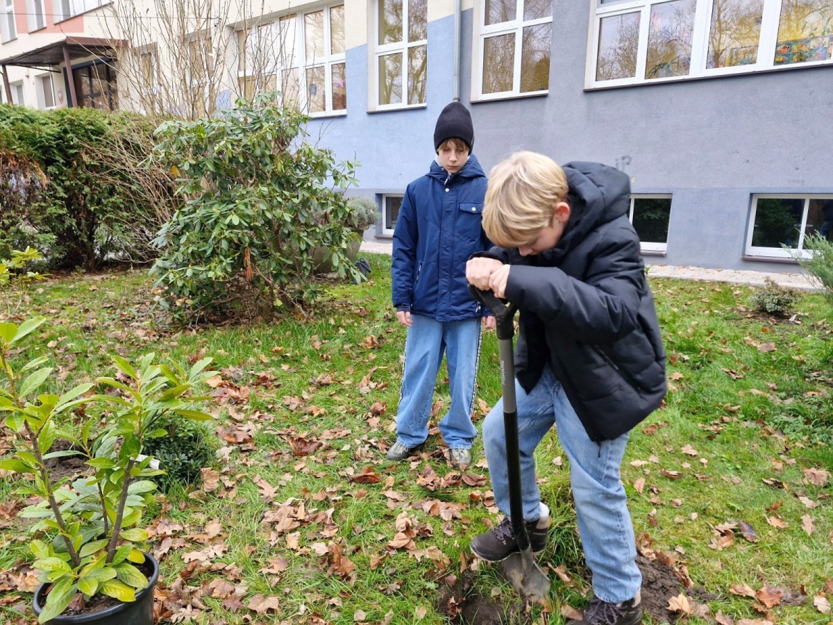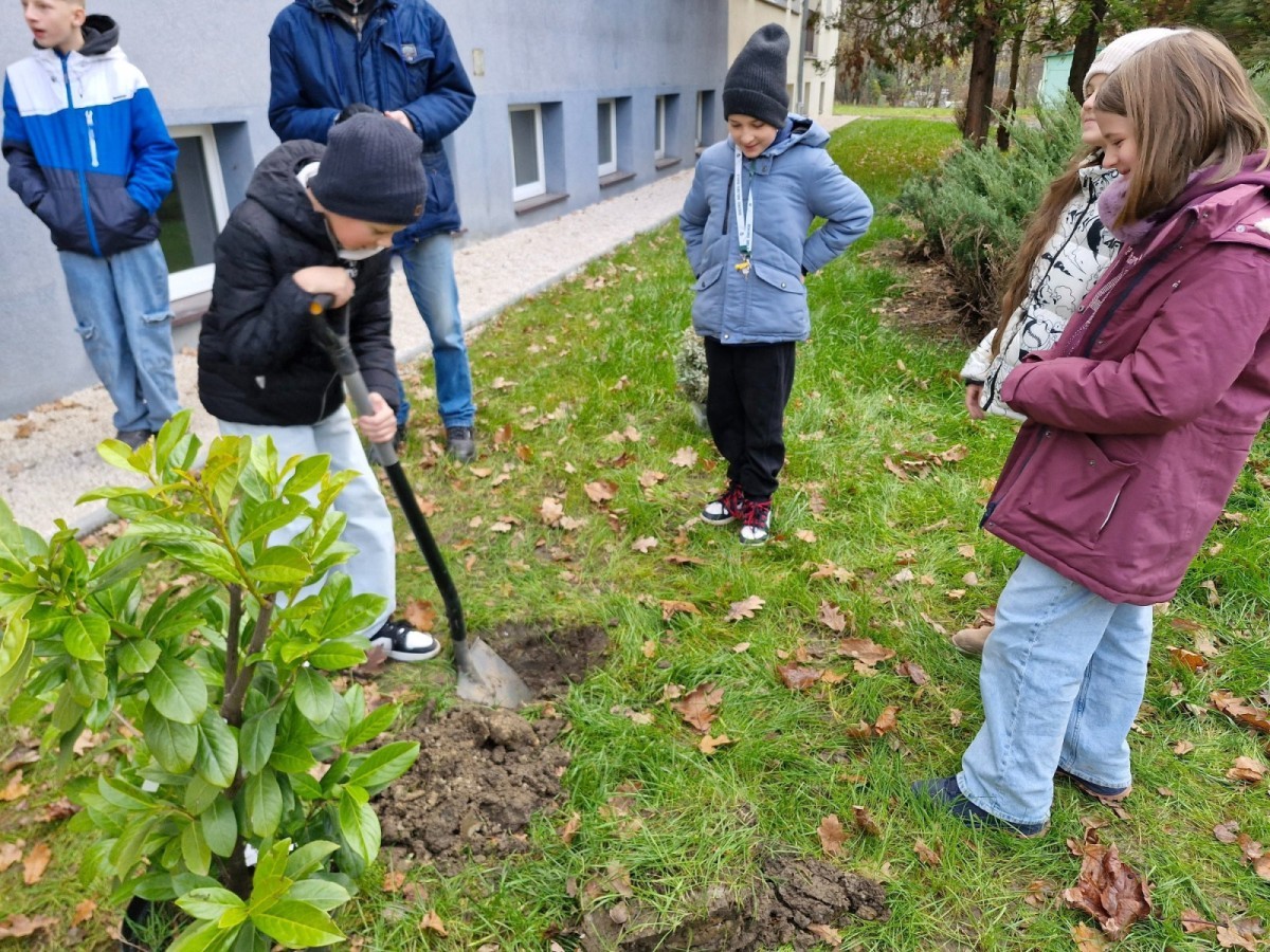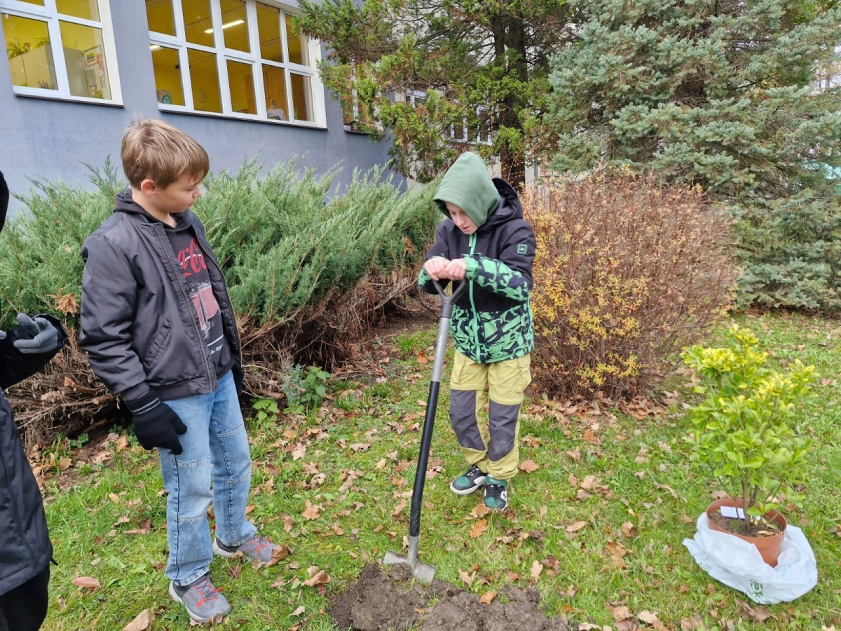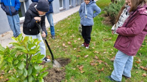 W listopadzie uczniowie klas 4b, 5a, 5b, 6a, 6b wzięli udział w ekologicznej akcji sadzenia krzewów, której celem było upiększenie i wzbogacenie różnorodności ogródka naszej szkoły. Uczniowie doskonale poradzili sobie z wykopaniem dołka, wsadzeniem krzewu i zasypaniem, pamiętali o delikatnym ubiciu ziemi.