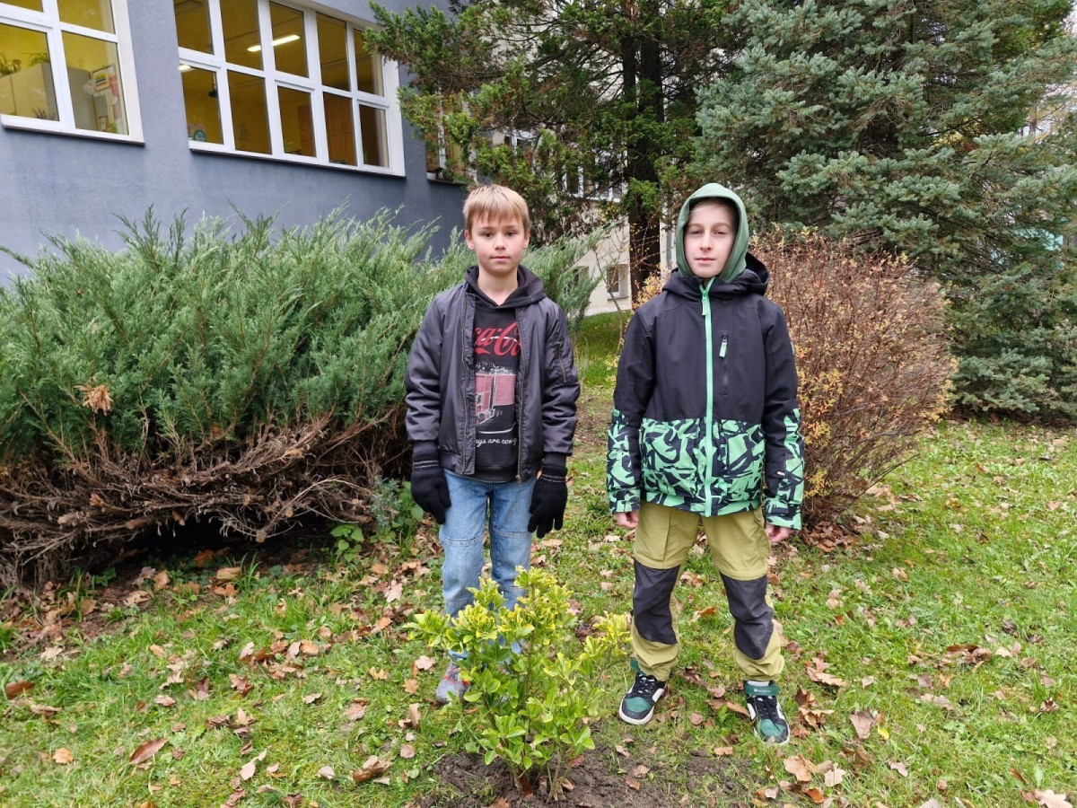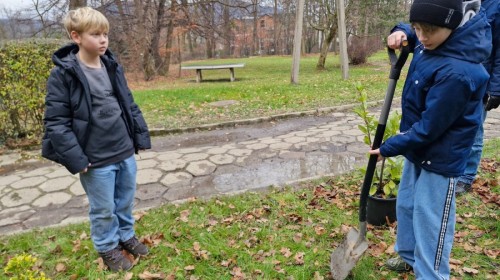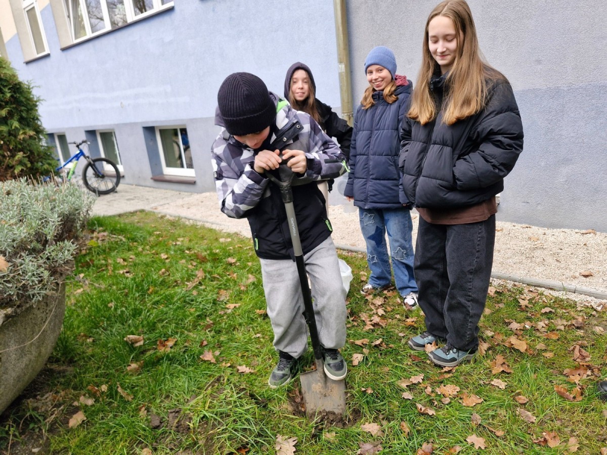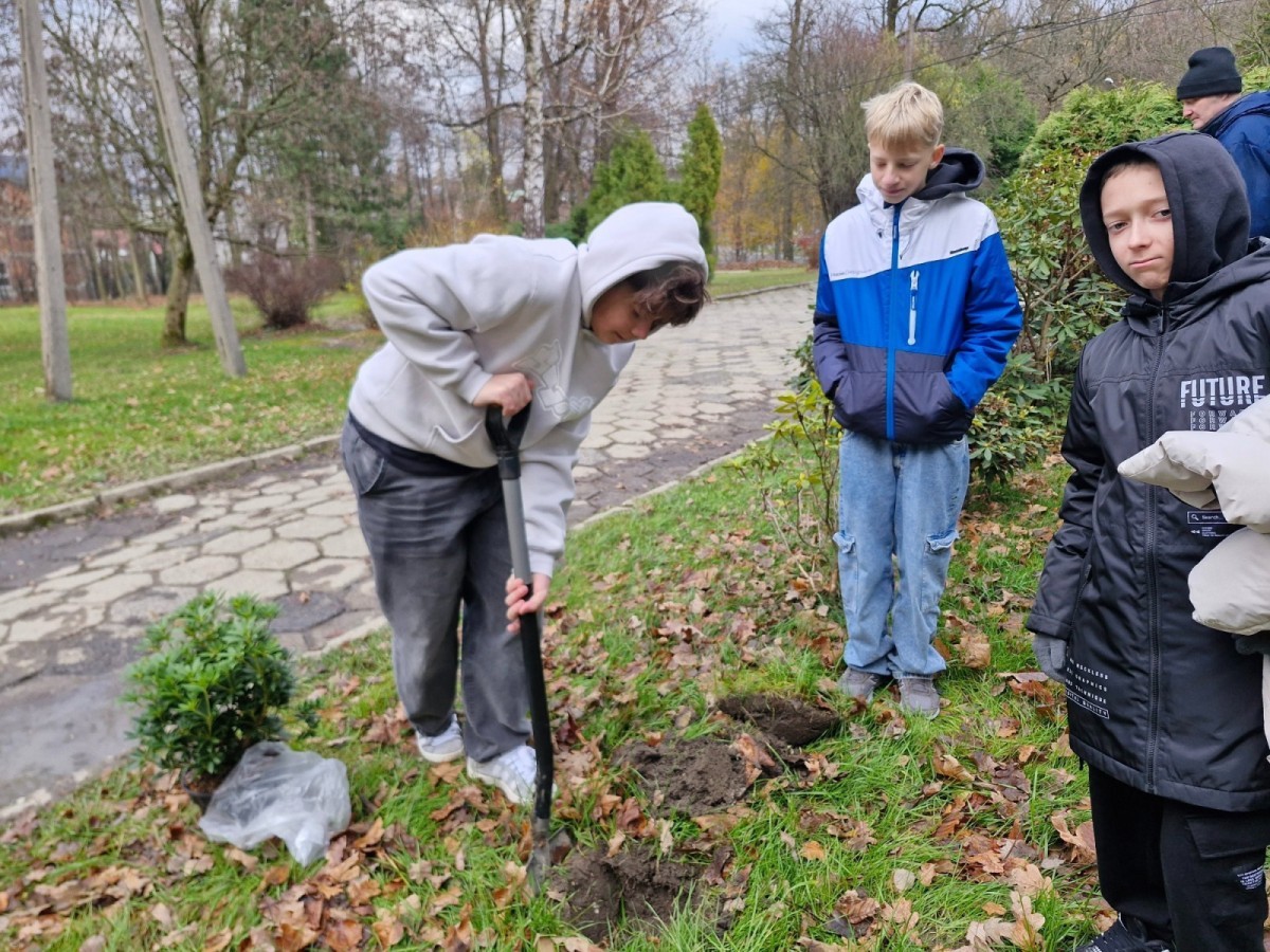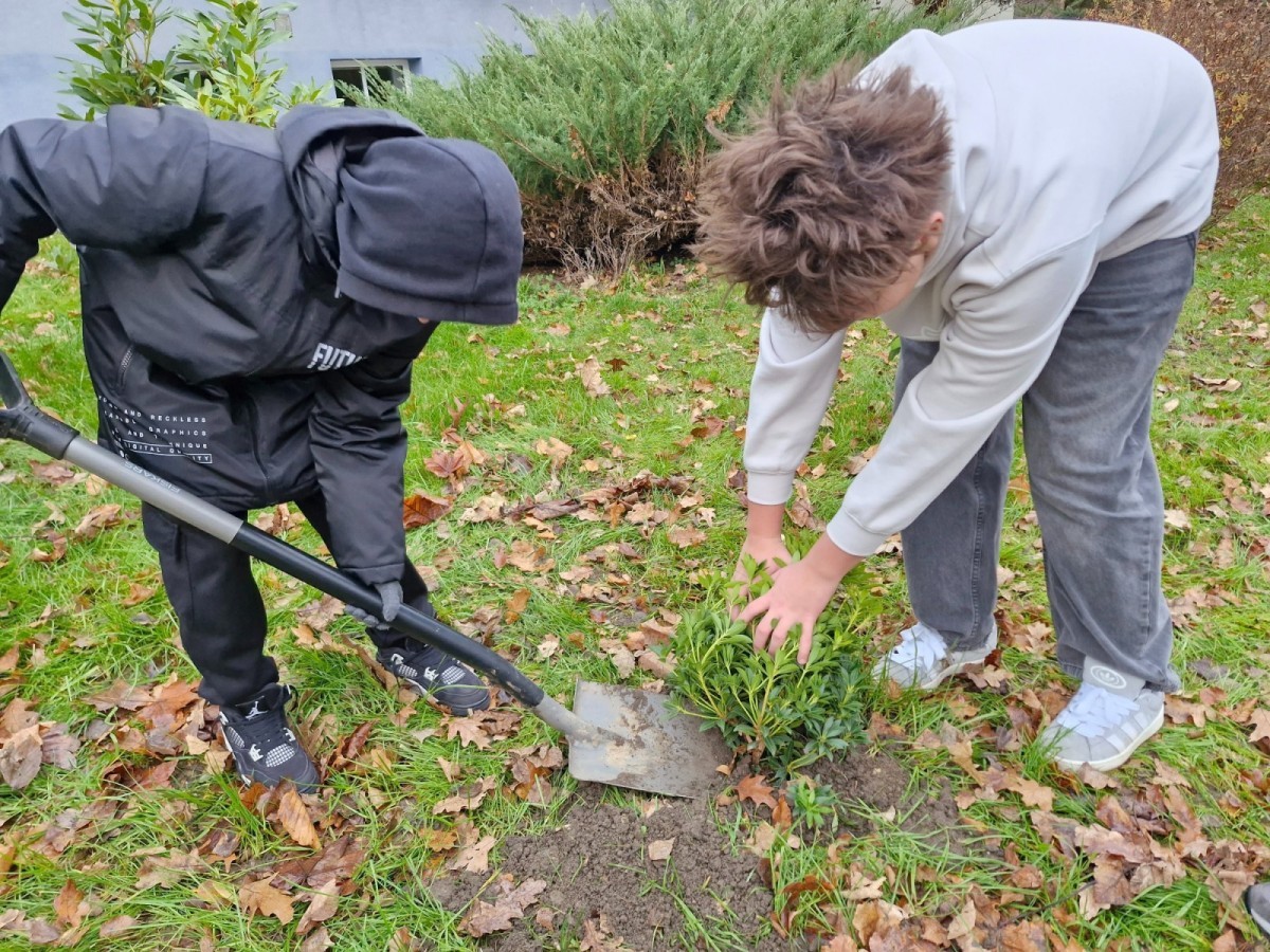 W listopadzie uczniowie klas 4b, 5a, 5b, 6a, 6b wzięli udział w ekologicznej akcji sadzenia krzewów, której celem było upiększenie i wzbogacenie różnorodności ogródka naszej szkoły. Uczniowie doskonale poradzili sobie z wykopaniem dołka, wsadzeniem krzewu i zasypaniem, pamiętali o delikatnym ubiciu ziemi.