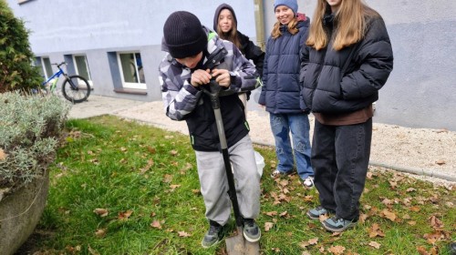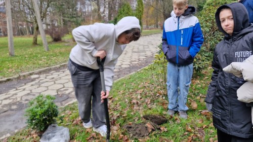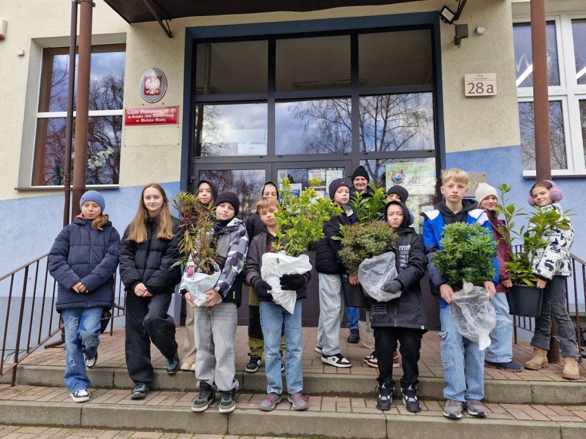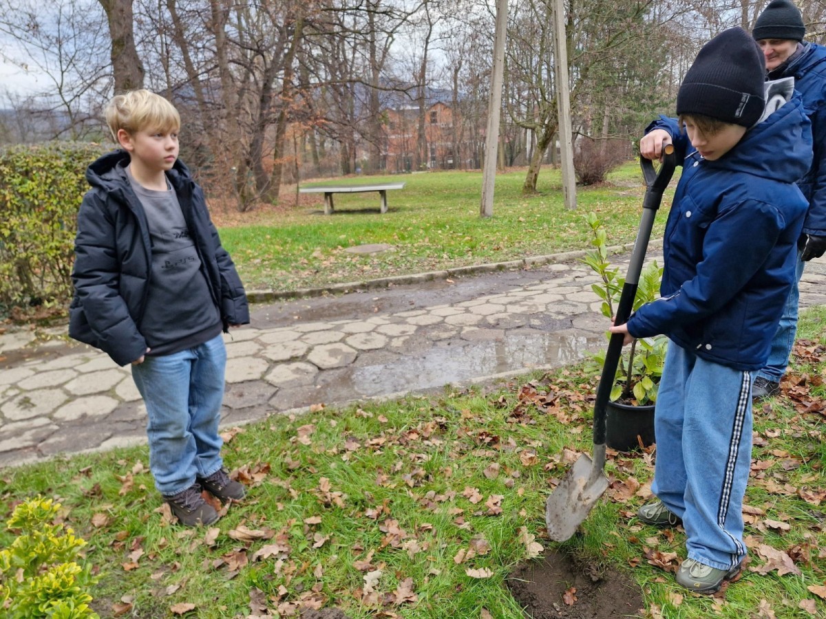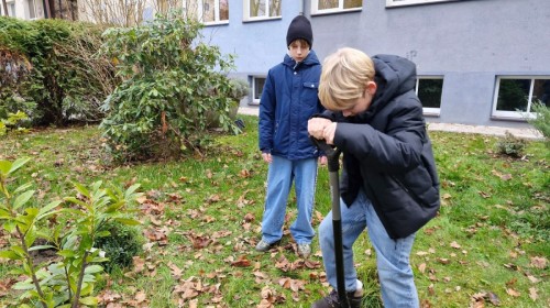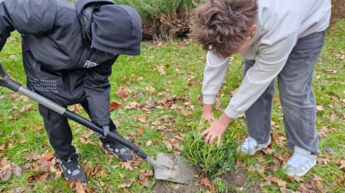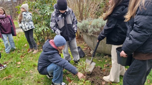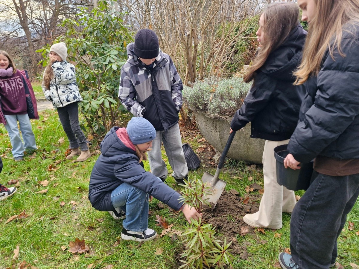 W listopadzie uczniowie klas 4b, 5a, 5b, 6a, 6b wzięli udział w ekologicznej akcji sadzenia krzewów, której celem było upiększenie i wzbogacenie różnorodności ogródka naszej szkoły. Uczniowie doskonale poradzili sobie z wykopaniem dołka, wsadzeniem krzewu i zasypaniem, pamiętali o delikatnym ubiciu ziemi.