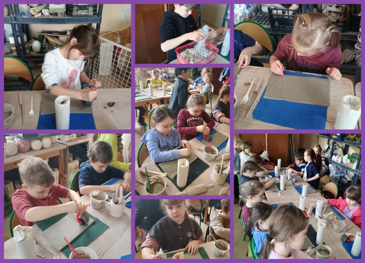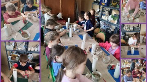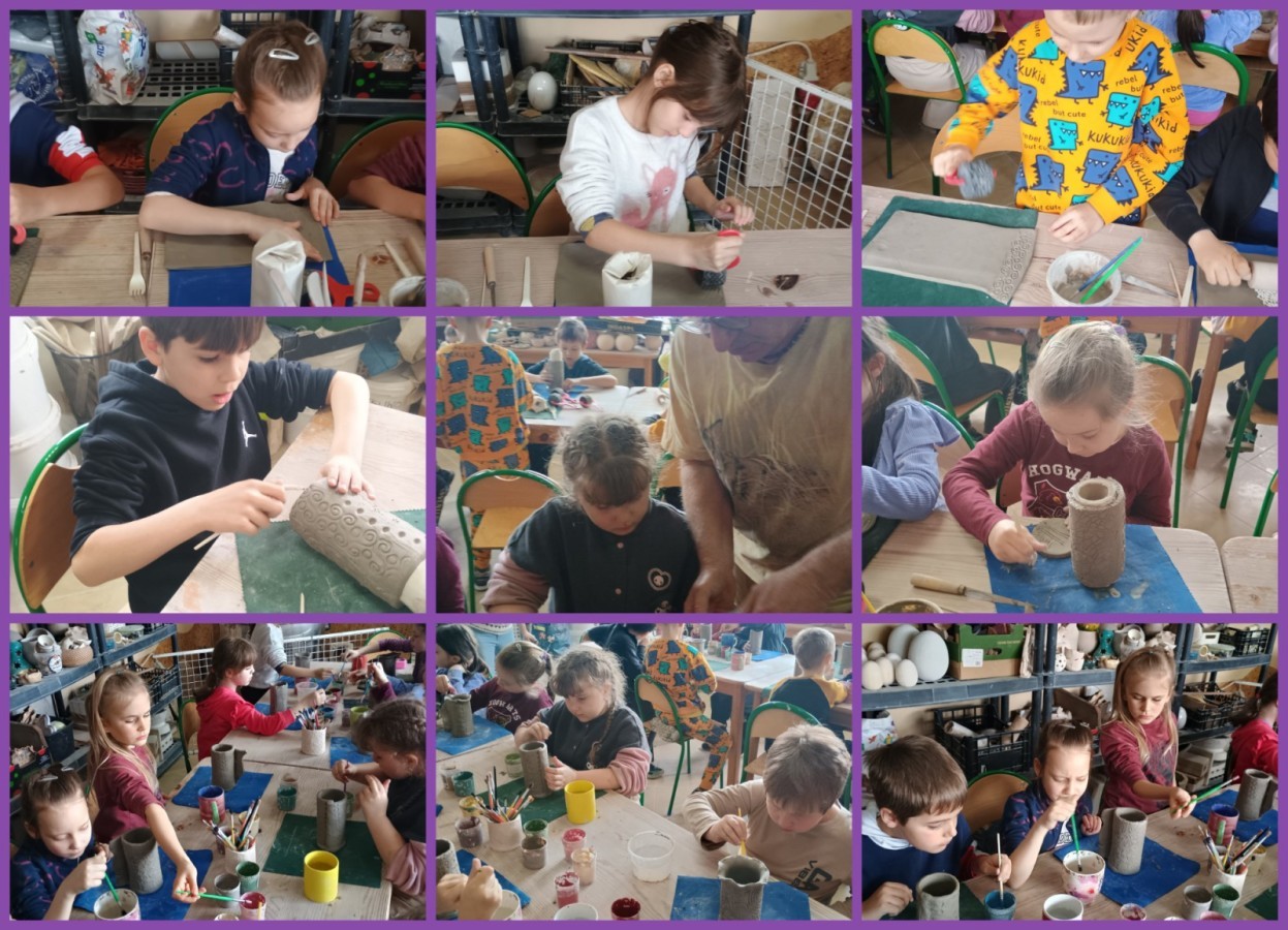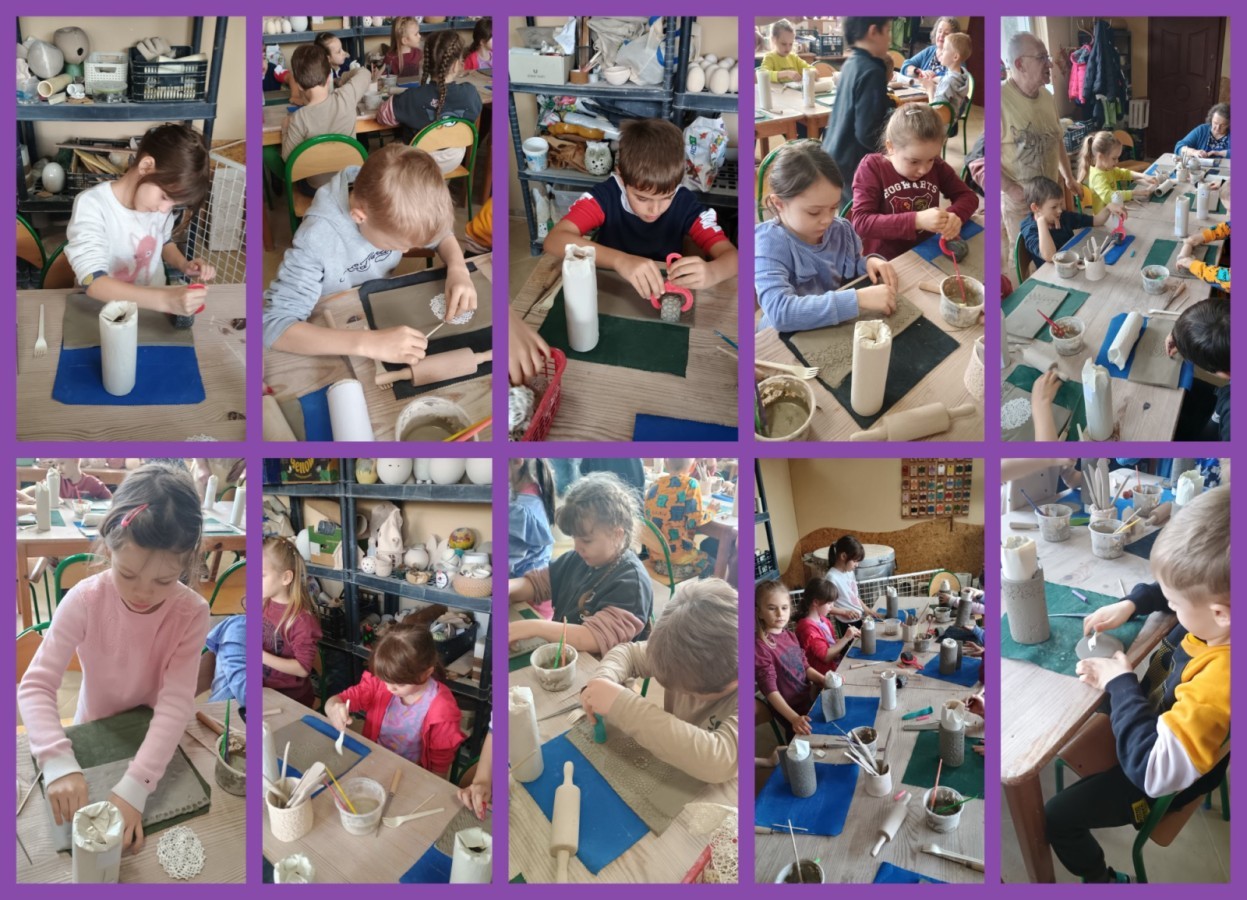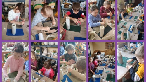 z gliny. W czasie zajęć, dzięki wspaniałym prowadzącym uczniowie szybko opanowali podstawowe techniki lepienia, a także ozdabiania czyli malowania specjalnymi farbkami gliny.