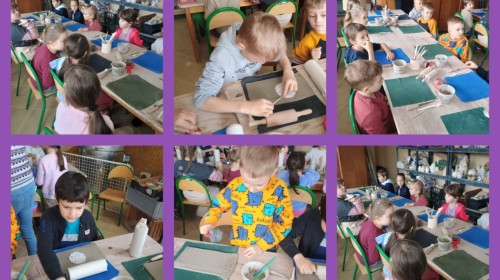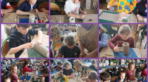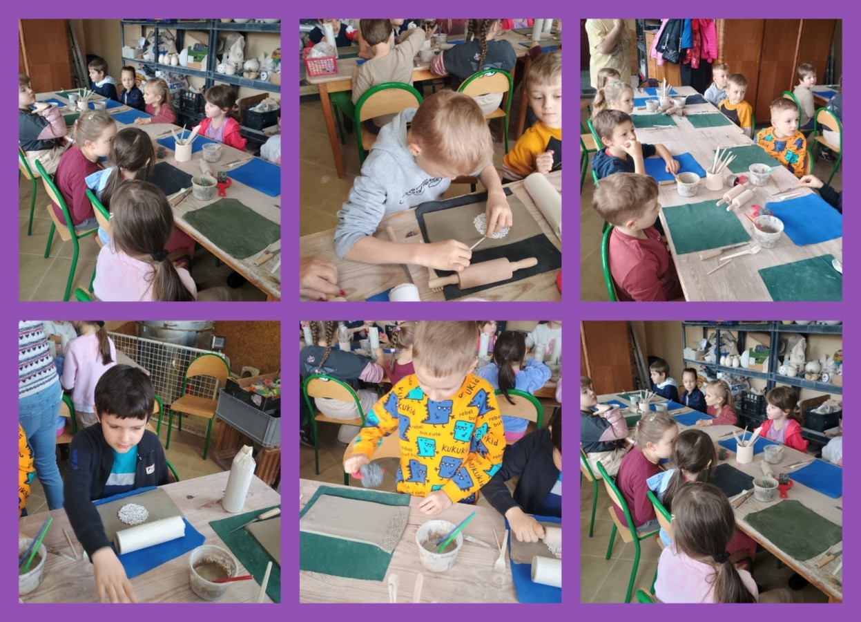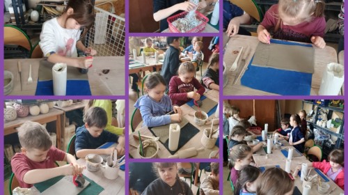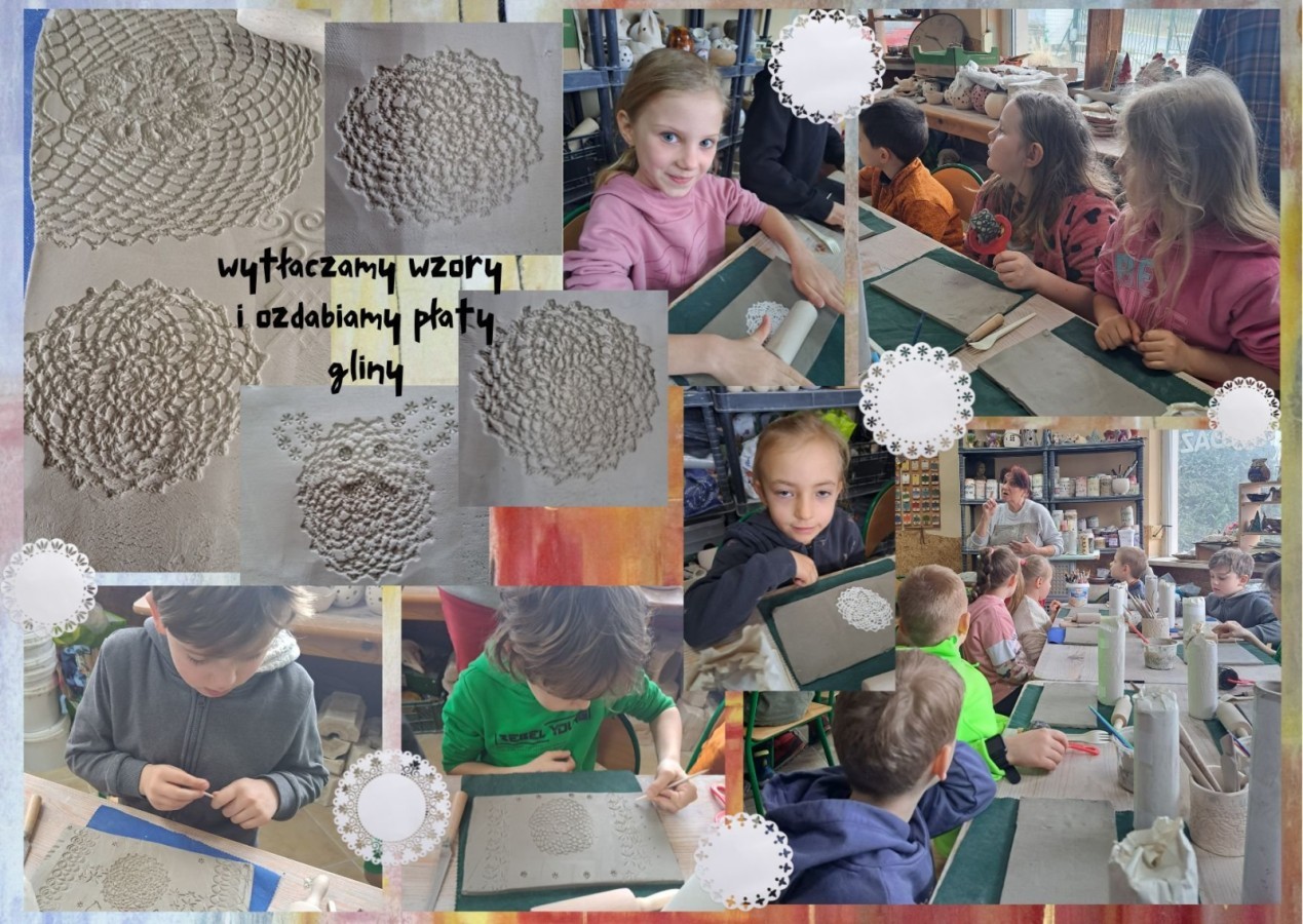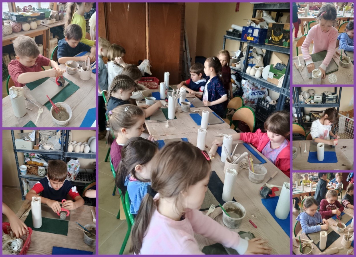 z gliny. W czasie zajęć, dzięki wspaniałym prowadzącym uczniowie szybko opanowali podstawowe techniki lepienia, a także ozdabiania czyli malowania specjalnymi farbkami gliny.