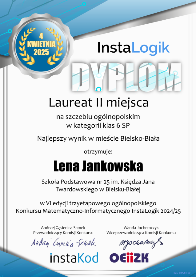 II stopnia w Ogólnopolskim Konkursie Matematyczno-Informatycznym InstaLogik!