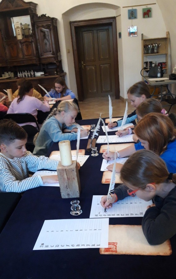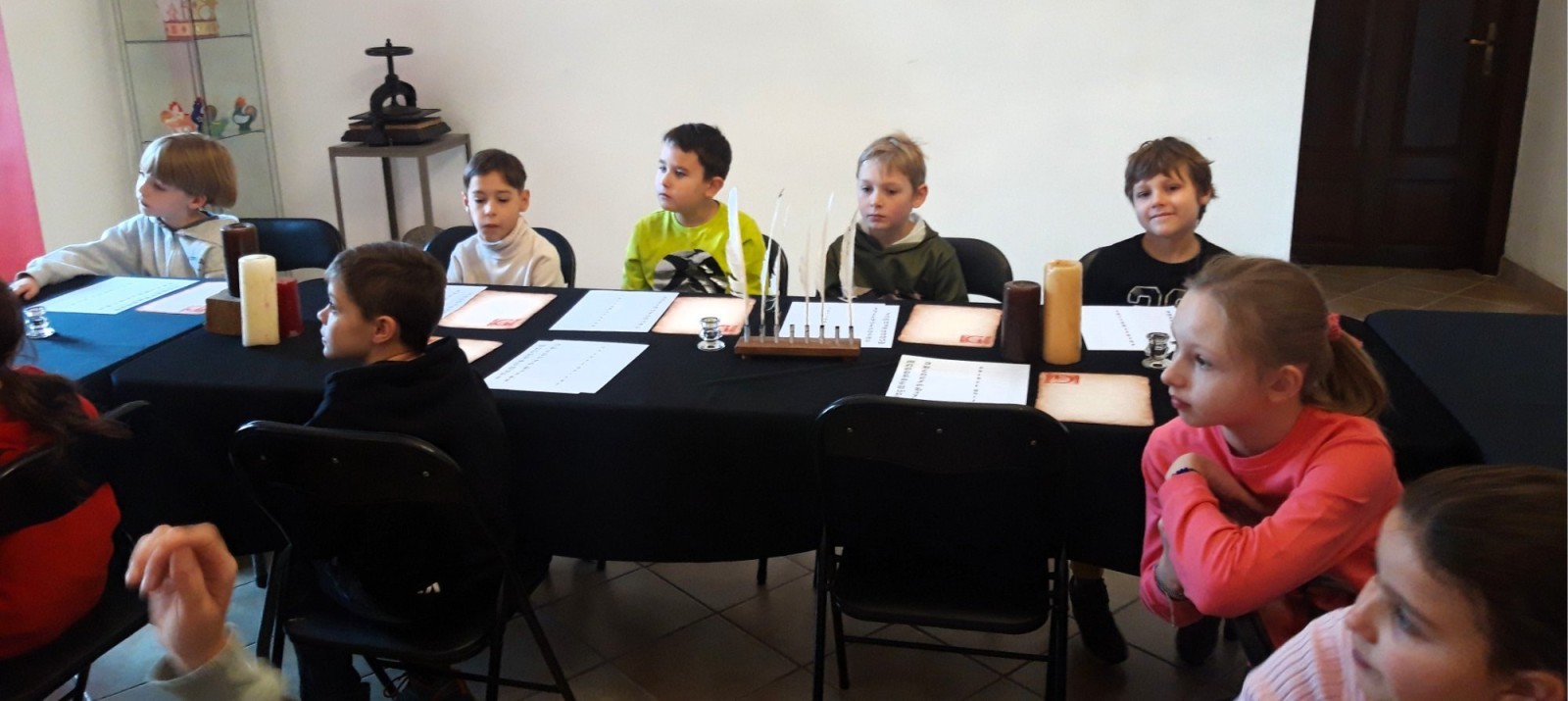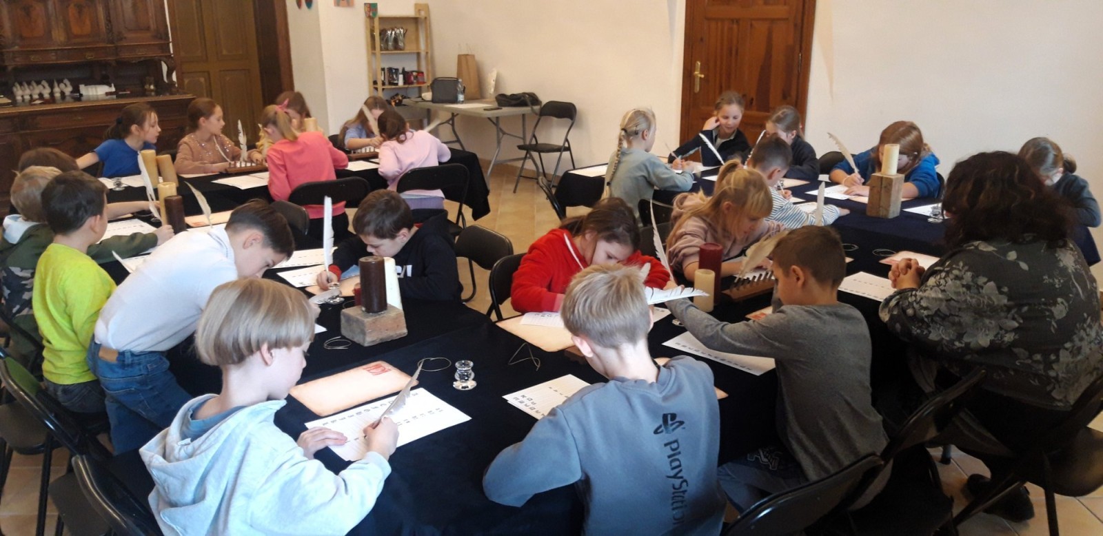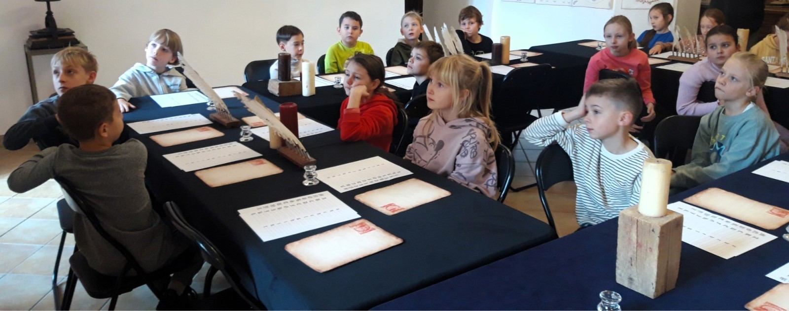 14 listopada 2025 r. uczniowie klasy 3a wybrali się do Zamku Sułkowskich w Bielsku-Białej. Uczestniczyli w zajęciach warsztatowych pt.: „W pracowni średniowiecznego skryby, czyli sztuka dawnego pisania”. Pracownicy muzeum zaprosili dzieci w niezwykłą podróż w świat pisma. Przygodę rozpoczęto od malowideł naskalnych, następnie poznano hieroglify egipskie, pismo klinowe, fenickie, a wędrówkę zakończono na alfabecie łacińskim. Uczestnicy warsztatów mieli okazję wczuć się w rolę dawnego skryby i spróbować techniki pisania gęsim piórem. Uczniowie przygotowali swój dokument na wzór średniowiecznych pergaminów, a nietykalności powstałych pism strzegła pieczęć lakowa, odlana na zakończenie warsztatów.