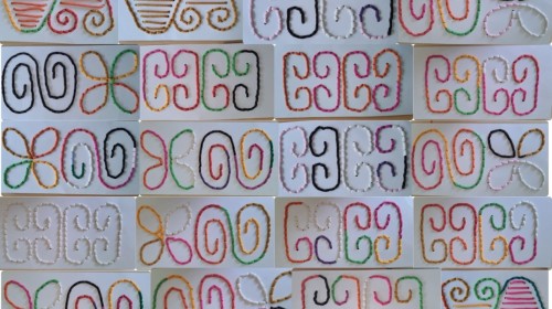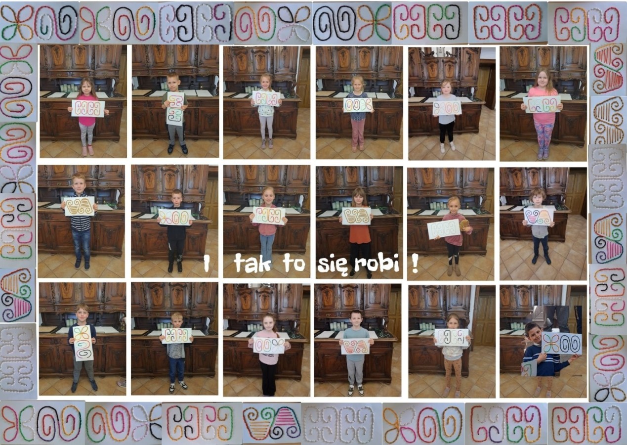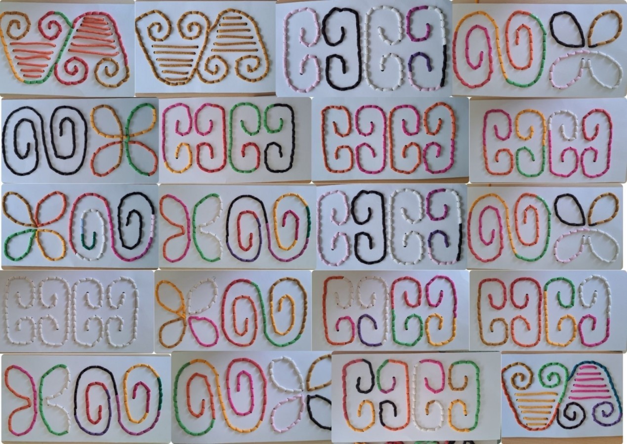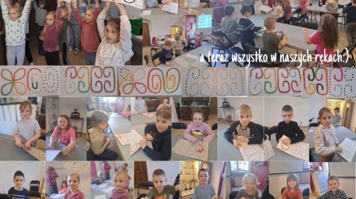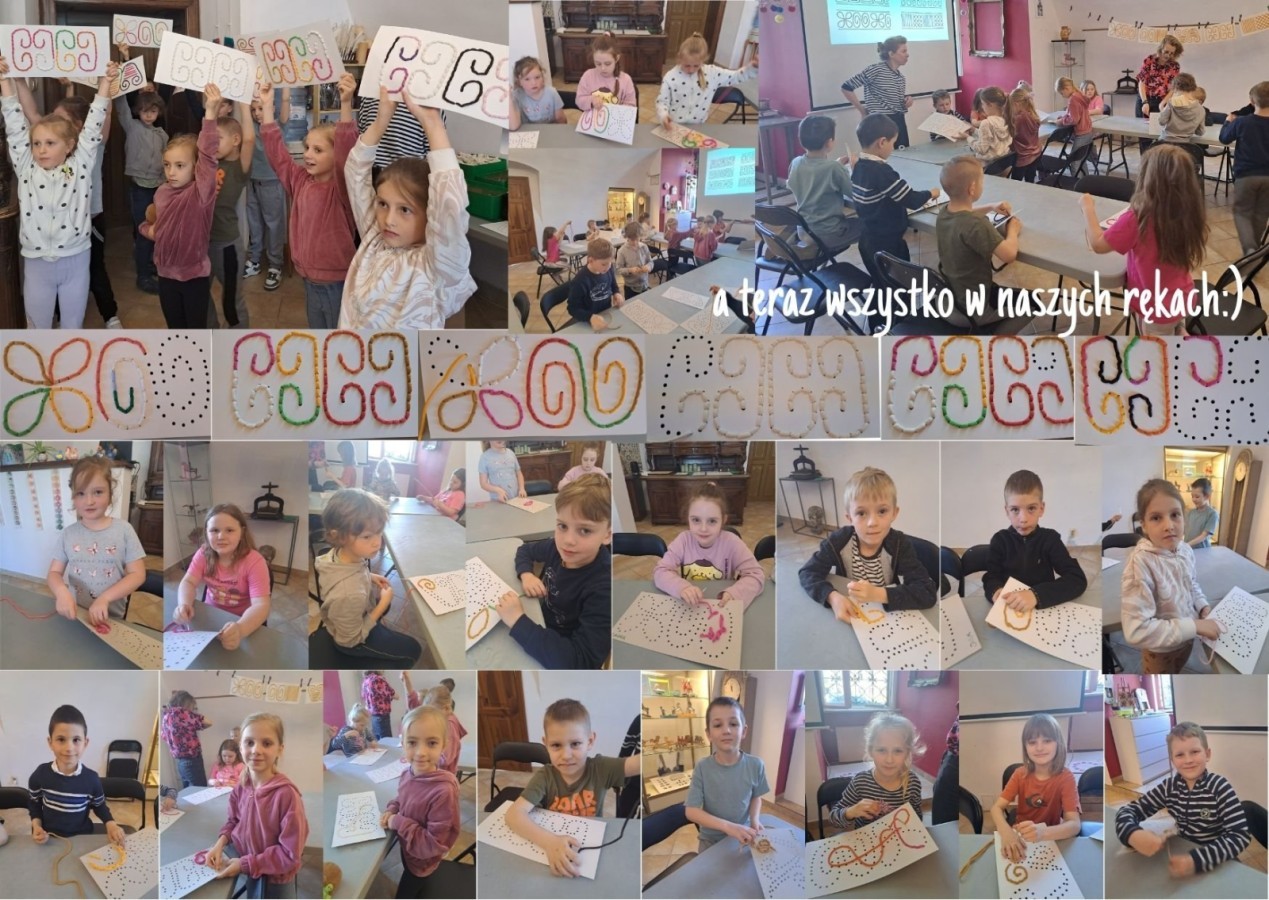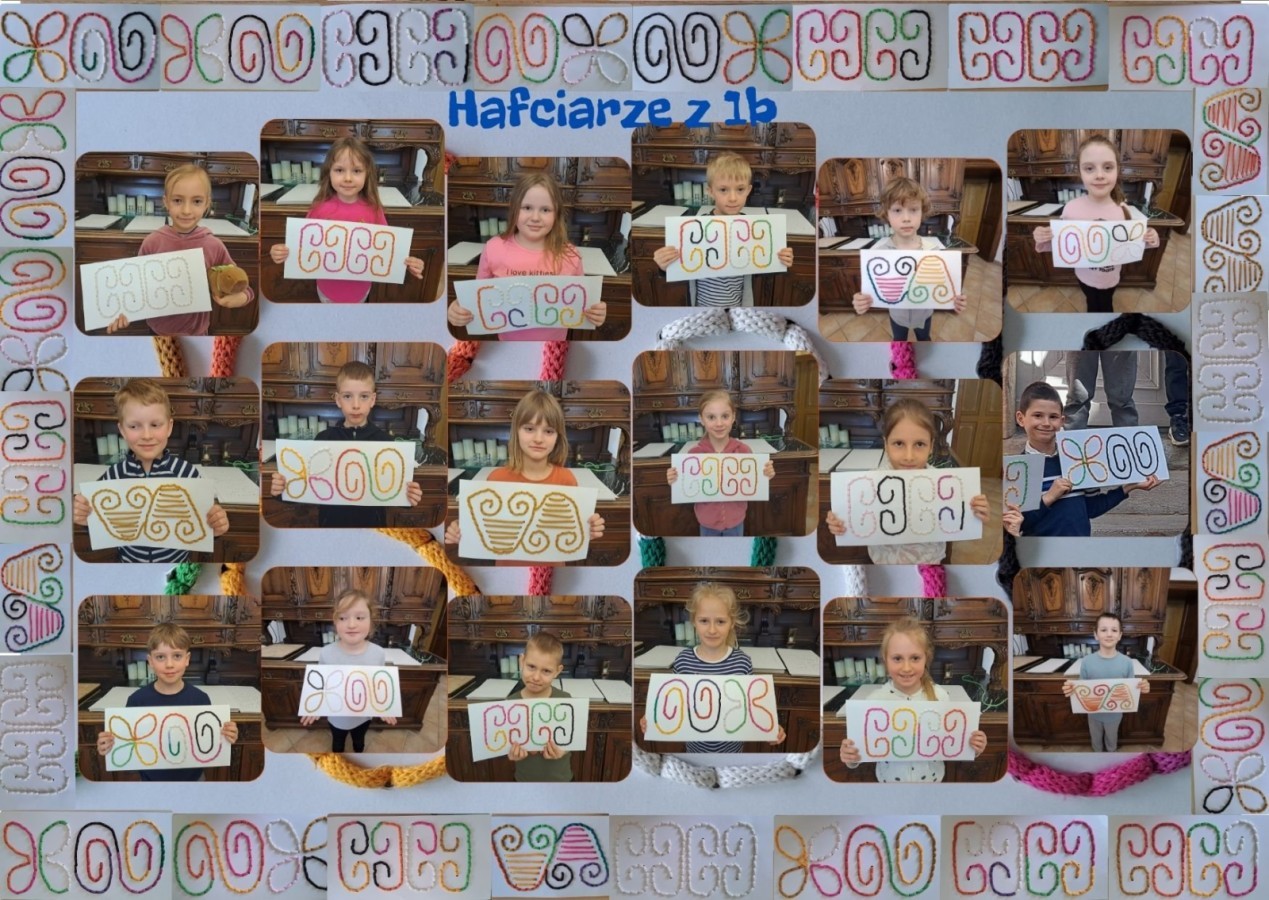 Po krótkim wykładzie pierwszaki spróbowały swoich sił w tej zanikającej technice. Na specjalnie przygotowanych kartonowych prostokątach, pełnych dziurek tworzących fantazyjne wilamowskie wzory, wypełniały kolorowymi nićmi wybrane przez siebie ślimacznice, pętle, krzyżyki czy pasy.
