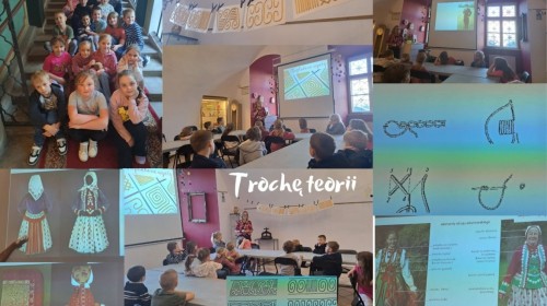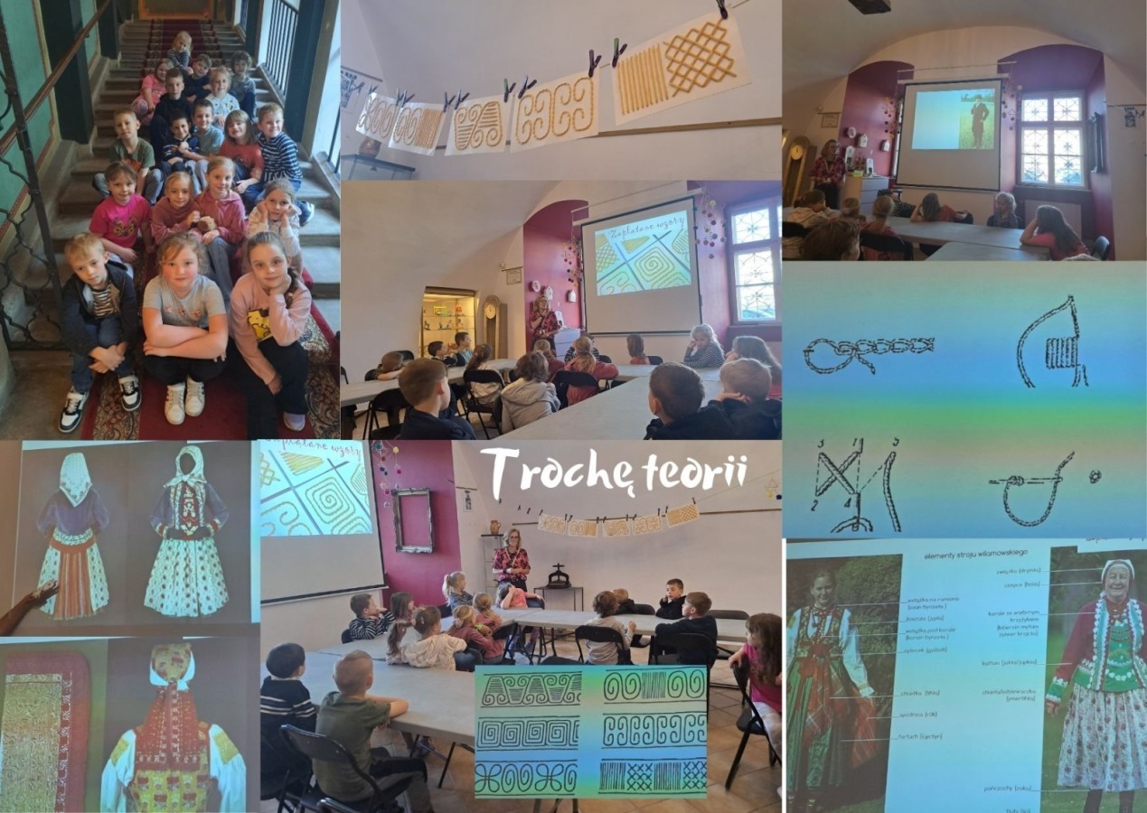 Dzieci zapoznały się z niezwykłą kolorystyką i zdobnictwem stroju wilamowskiego oraz ze wszystkimi rodzajami haftów ręcznych, występujących w stroju wilamowskim.