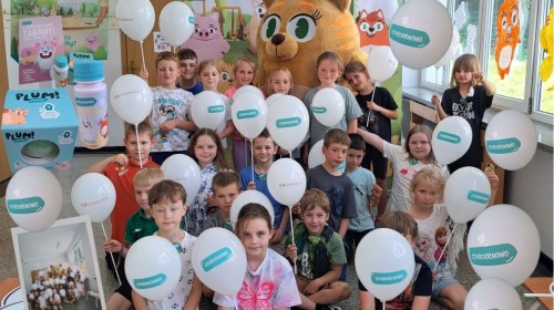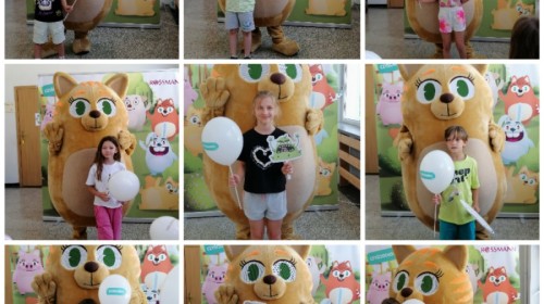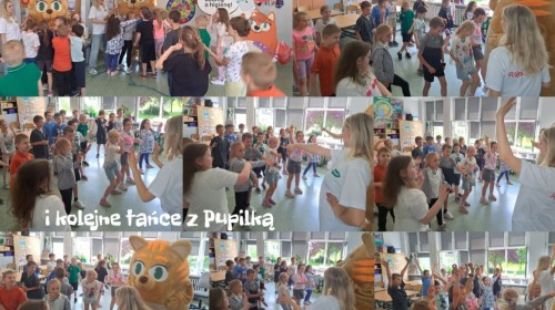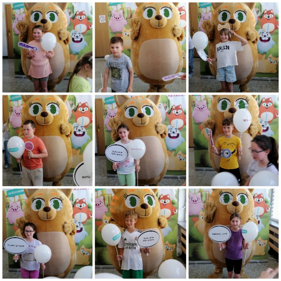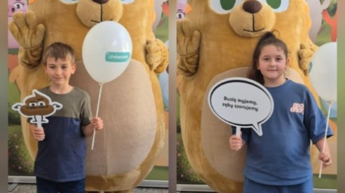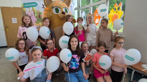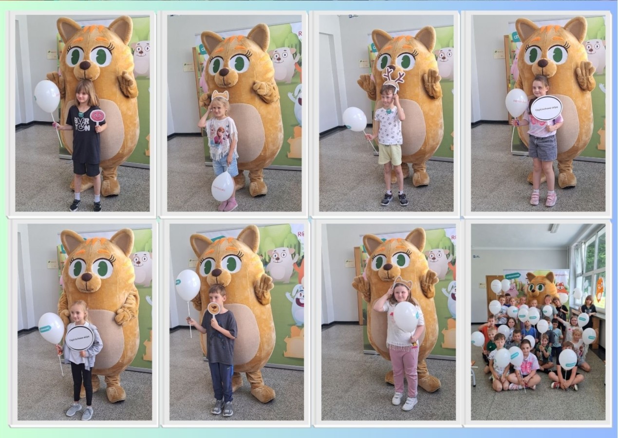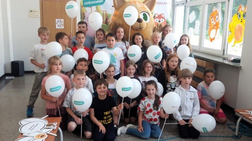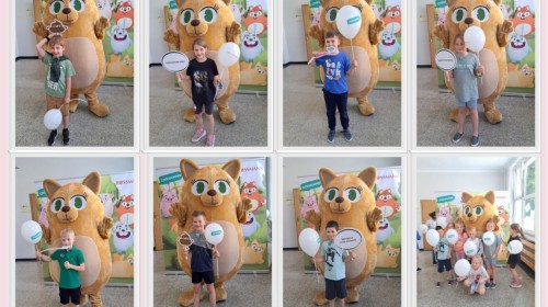 Na koniec każdy uczeń mógł przybić piątkę z Pupilką i stanąć przy niej do pamiątkowego zdjęcia. W nagrodę za wygranie konkursu uczniowie otrzymali również drobne prezenty.