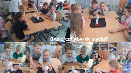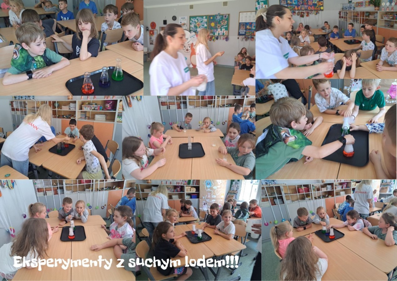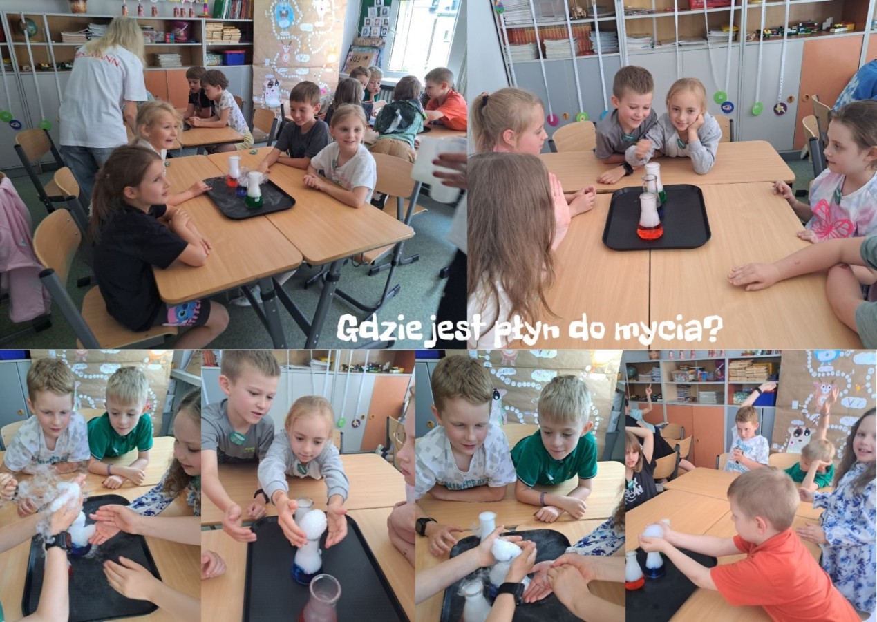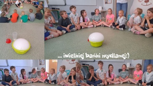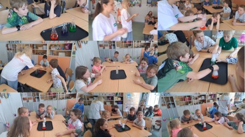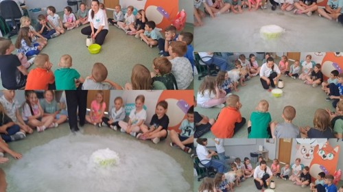 Kolejną atrakcją były eksperymenty chemiczne, dzięki którym dowiedzieliśmy się, kiedy ręce są brudne, jak ten brud usunąć, jak zobaczyć go, choć wydaje się, że jest niewidoczny, postaraliśmy się także wydmuchać i zobaczyć dwutlenek węgla. Jednak najbardziej zachwyciły nas eksperymenty z suchym lodem a okrzyki podziwu wzbudziła wielka chmura i ogromne wybuchające bańki.