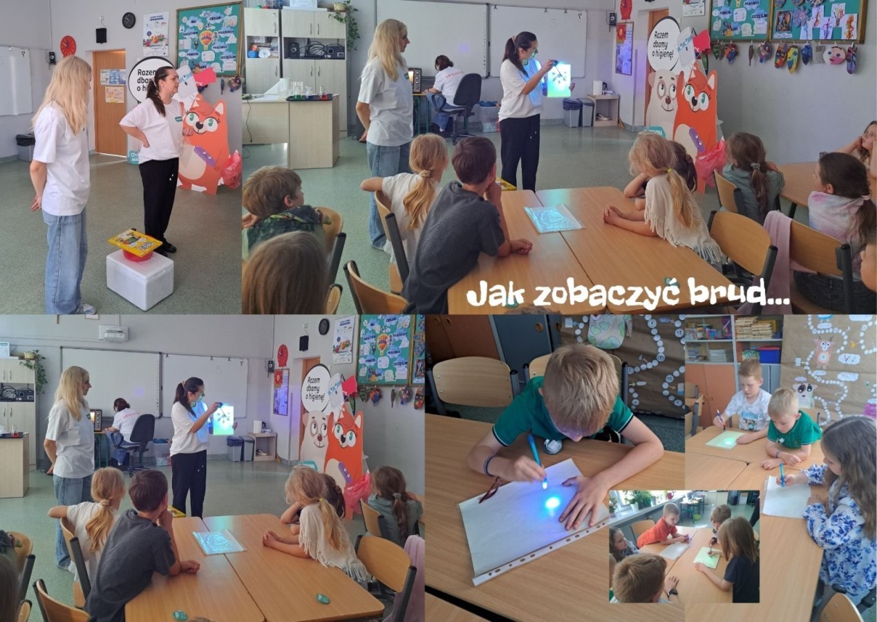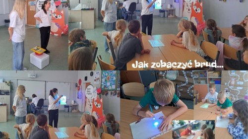 W pierwszej części kotka Pupilka wraz z trojgiem animatorów i naukowców zaprosiła pierwszaków do wspólnej zabawy, tańców i śpiewu. Uczniowie musieli także wykazać się sporą wiedzą na temat higieny i zasad jej utrzymania podczas krótkiego Quizu. Następnie zaproszono dzieci do stolików, gdzie na specjalnych termicznych kartach odrysowywali, kolorowali
