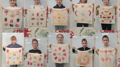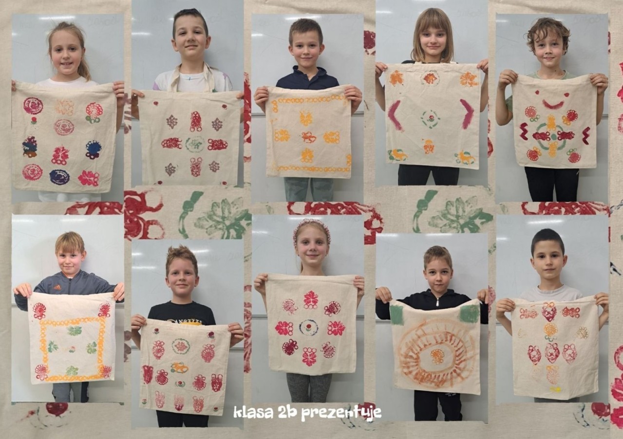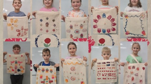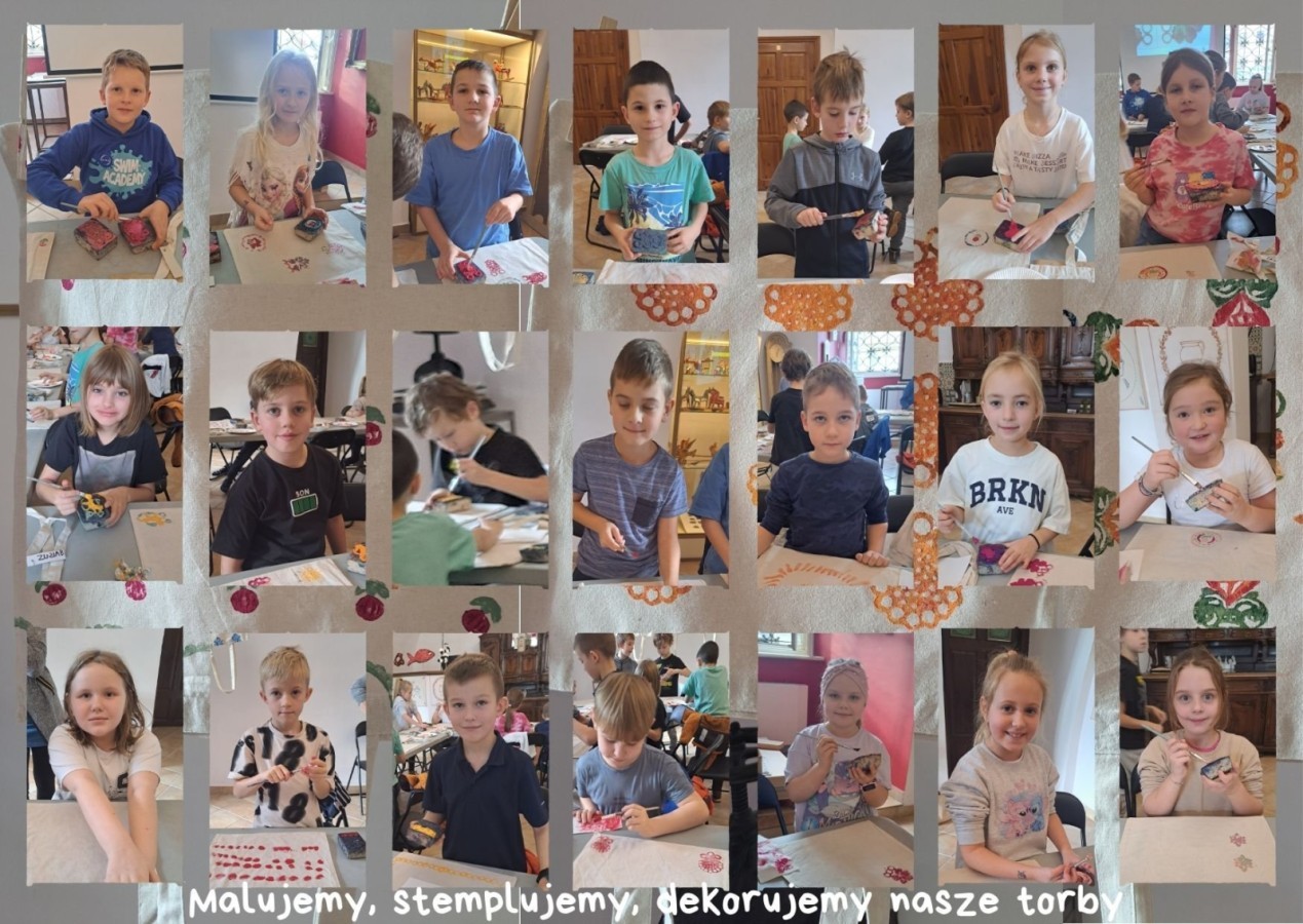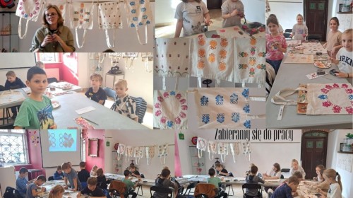 W sali warsztatowej każdy uczestnik zajęć wymyślił własny wzór w oparciu o dostępne stemple inspirowane hoczkami, wytłaczanymi lub odlewanymi. Zaprojektowaną kompozycję dzieci zastosowały na torbie na zakupy.
