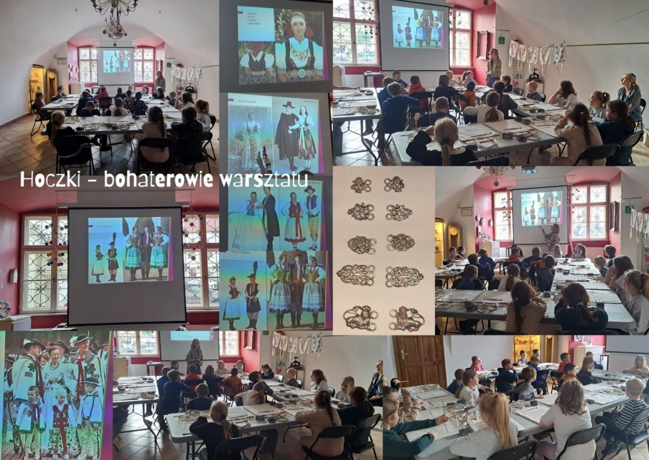 Zajęcia w zamku poświęcone były historii hoczków – metalowych części tradycyjnego stroju cieszyńskiego. Mieliśmy okazję zapoznać się z bogatą kolekcją zbiorów Muzeum oraz różnymi technikami ich wytwarzania. Prócz tego poznaliśmy nazwy pozostałych elementów stroju, jak żywotek, kabotek, fartuch, napierśnik czy guzy.