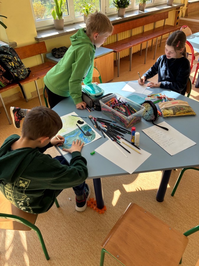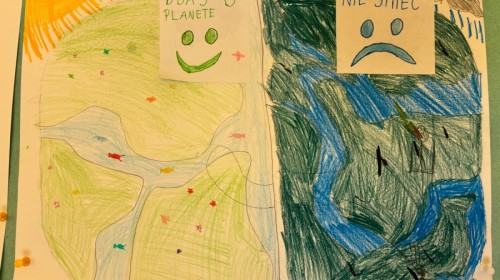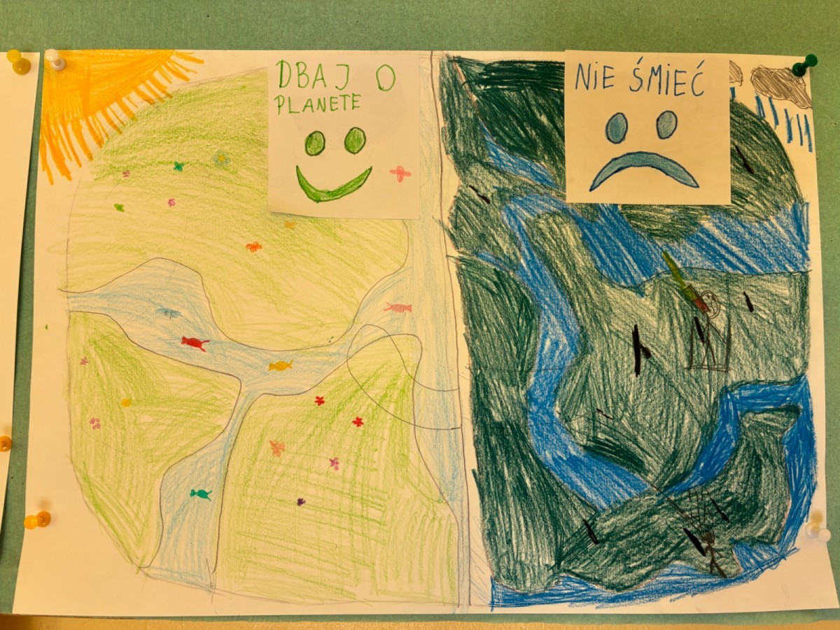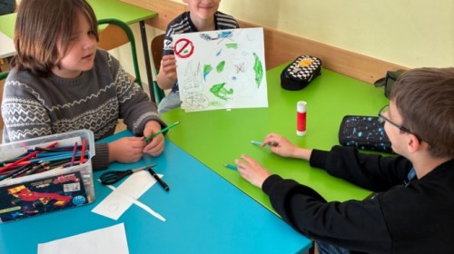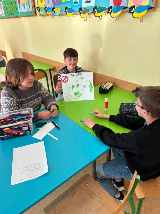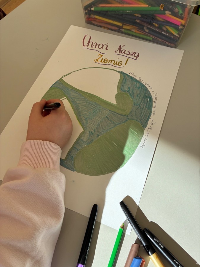 W ramach kwietniowych obchodów Dnia Ziemi uczestnicy świetlicy pracowali w grupach, zastanawiając się, jak najlepiej dbać o naszą planetę. Wspólnie omawiali codzienne działania, które pomagają chronić środowisko, a swoje pomysły przedstawili w formie kolorowych i pomysłowych plakatów.