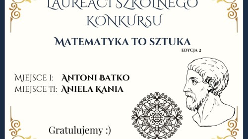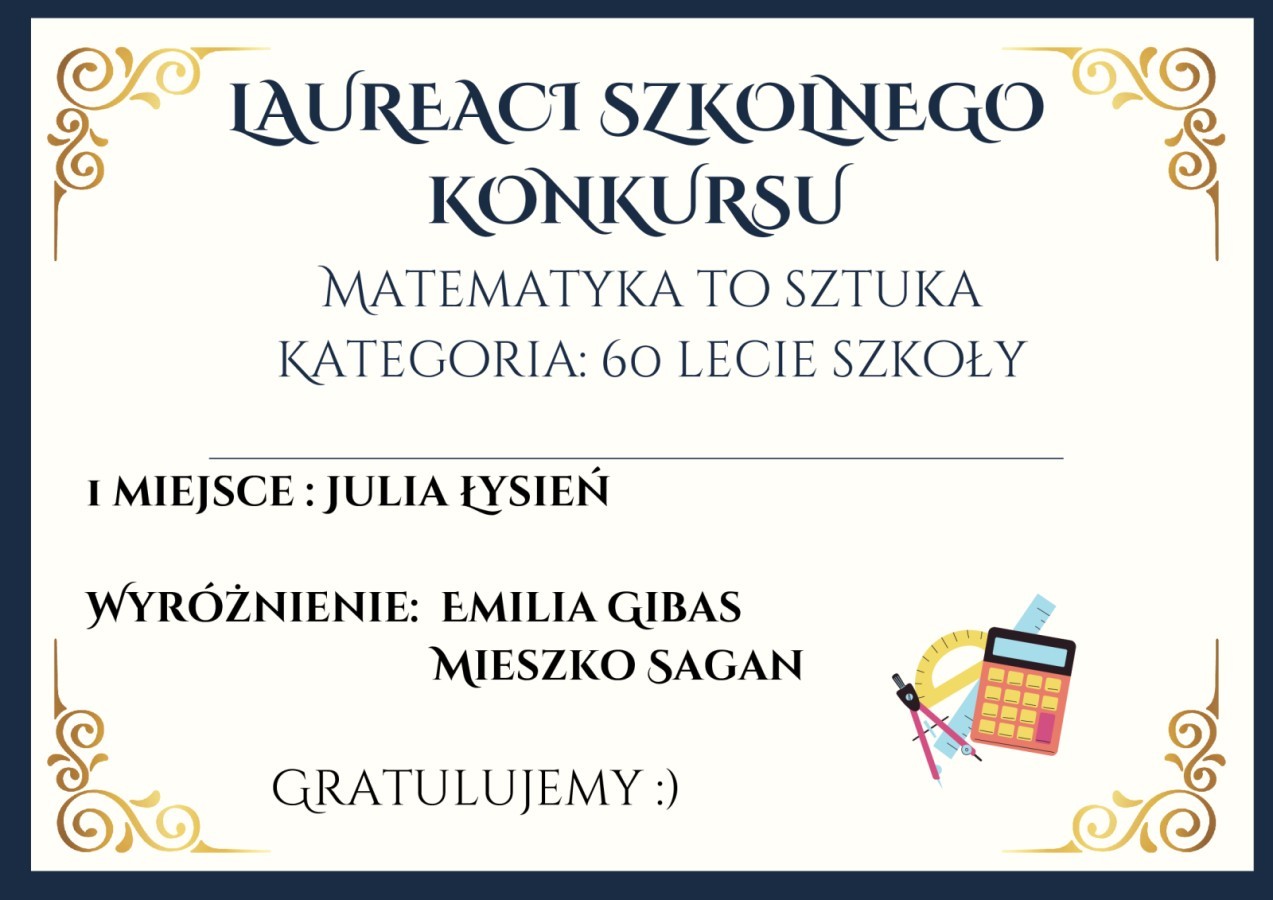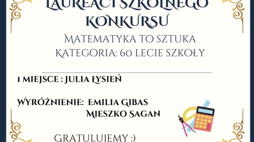 Serdecznie zapraszamy uczniów klas IV–VIII do udziału w kolejnej edycji szkolnego konkursu plastycznego „Matematyka to sztuka”. W tym roku konkurs jest wyjątkowy, ponieważ jedna z kategorii nawiązuje do jubileuszu 60-lecia naszej szkoły.