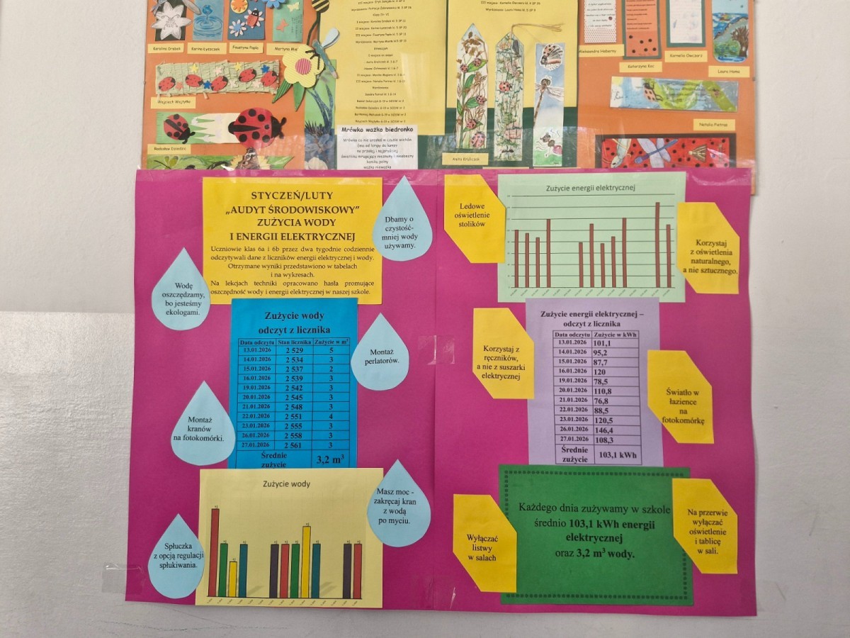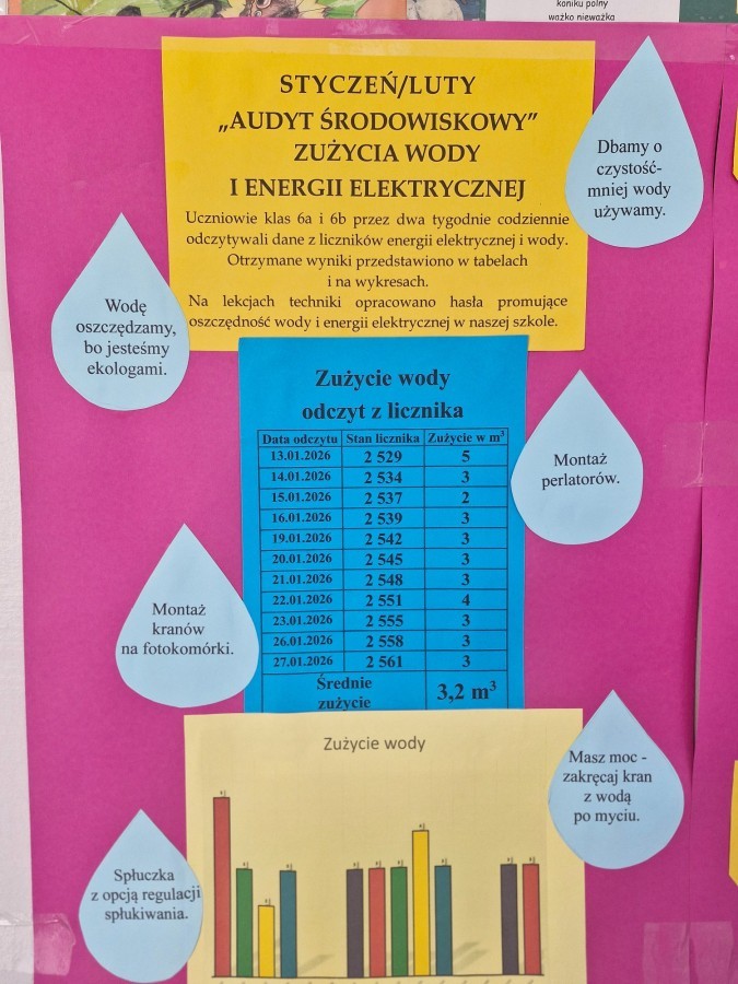w szkole „audyt środowiskowy”. Uczniowie klas 6a i 6b przez dwa tygodnie codziennie odczytywali dane z liczników energii elektrycznej i wody. Otrzymane wyniki przedstawiono w tabelach
