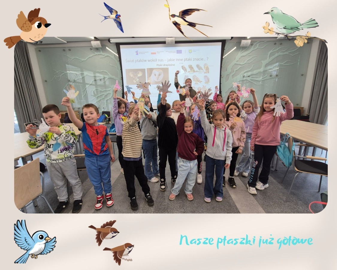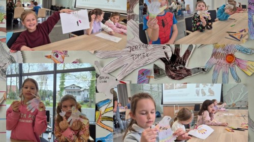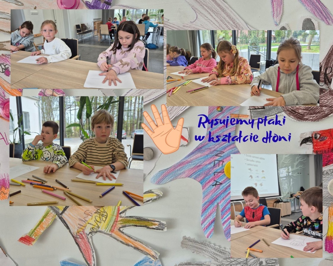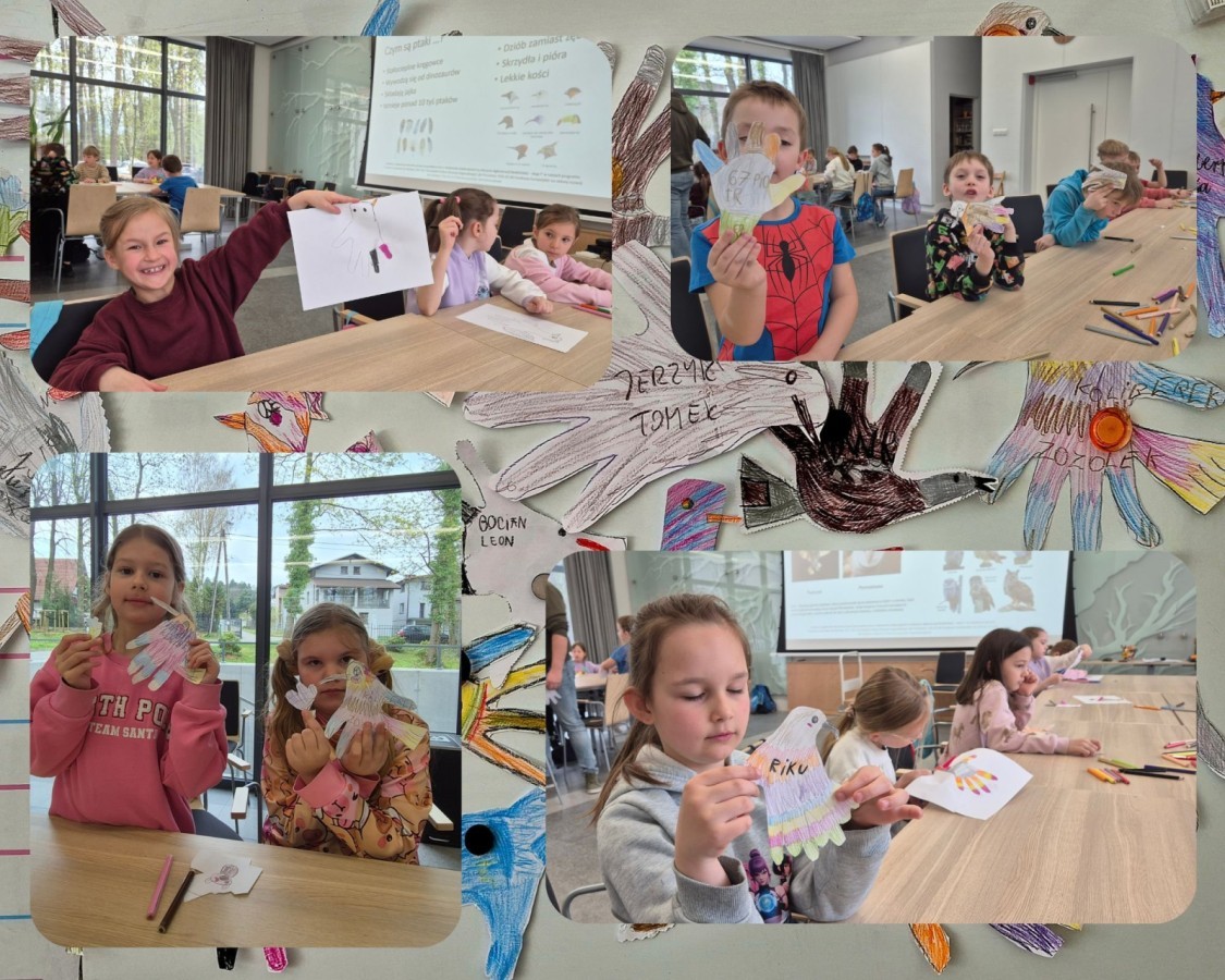 Podczas zajęć uczniowie dowiedzieli się również, na czym polegają badania ornitologiczne oraz jak przebiega proces obrączkowania ptaków. Warsztaty miały także charakter twórczy – dzieci wykonały piękne, kolorowe ptaki z odrysowanych dłoni oraz tworzyły własne obrączki.